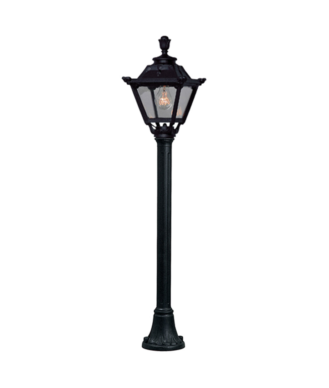 Part of the Fumagalli Golia range, this is a 1100mm post with E27 classic style square lantern. The Fumagalli post is a structural metal pole covered with a shockproof resin material making it rust and corrosion-free. Insulation class II, protection rating IP55.