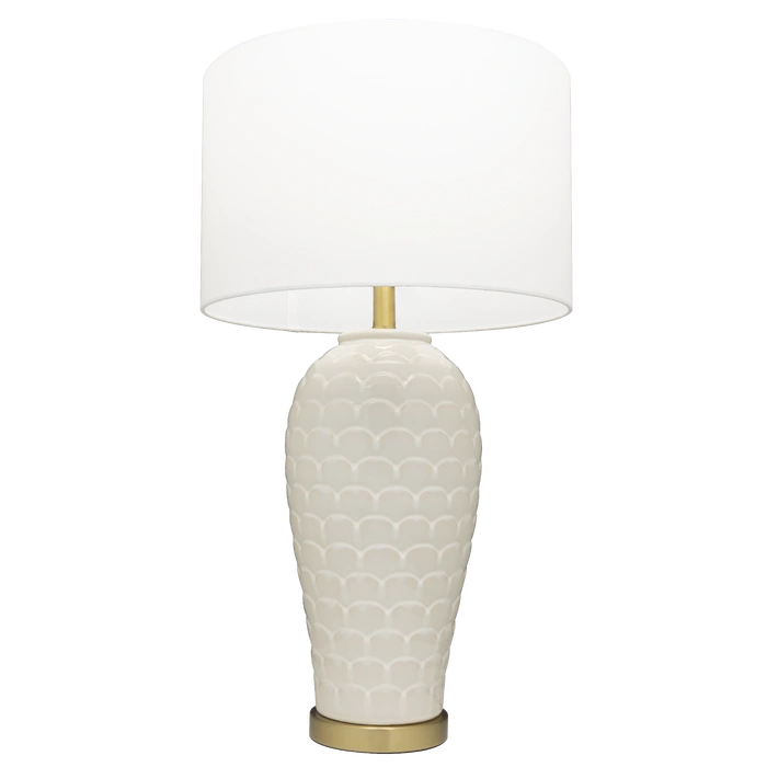 The base of the Murcia lamp is made of white, glazed ceramic, with a pattern resembling overlapping scales or waves. They are delicately highlighted with a pale brick color. At first glance, the lamp seems white/cream, only when we start looking at the details do we see this subtle contrast. The metal elements are finished in brushed brass.