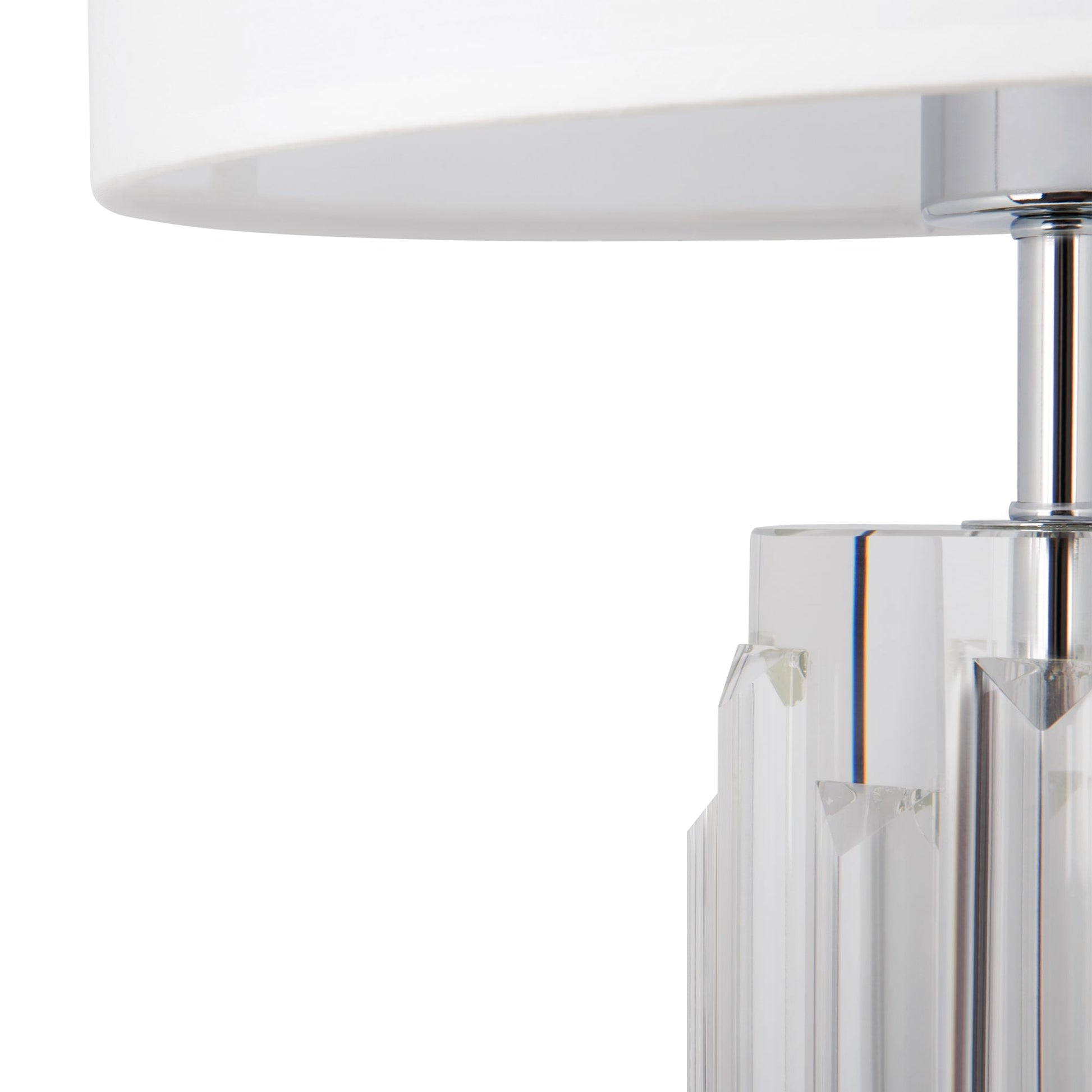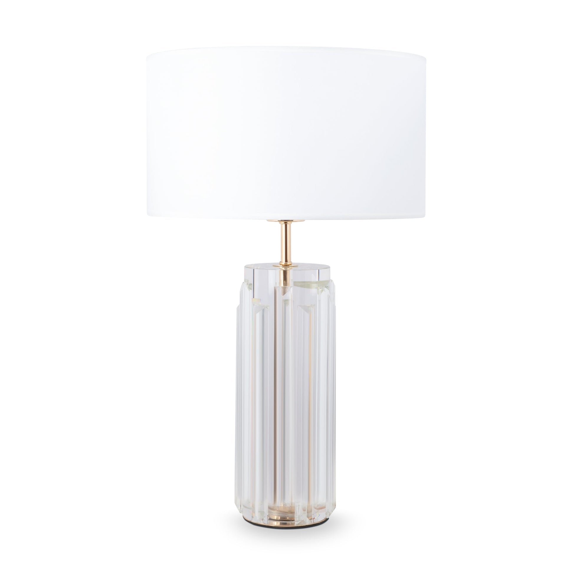 Metal base completed with sculptural cast glass in three shades: smoky, powdery pink, transparent. Cotton lampshade of white color. Light source — lamp with E27 base.