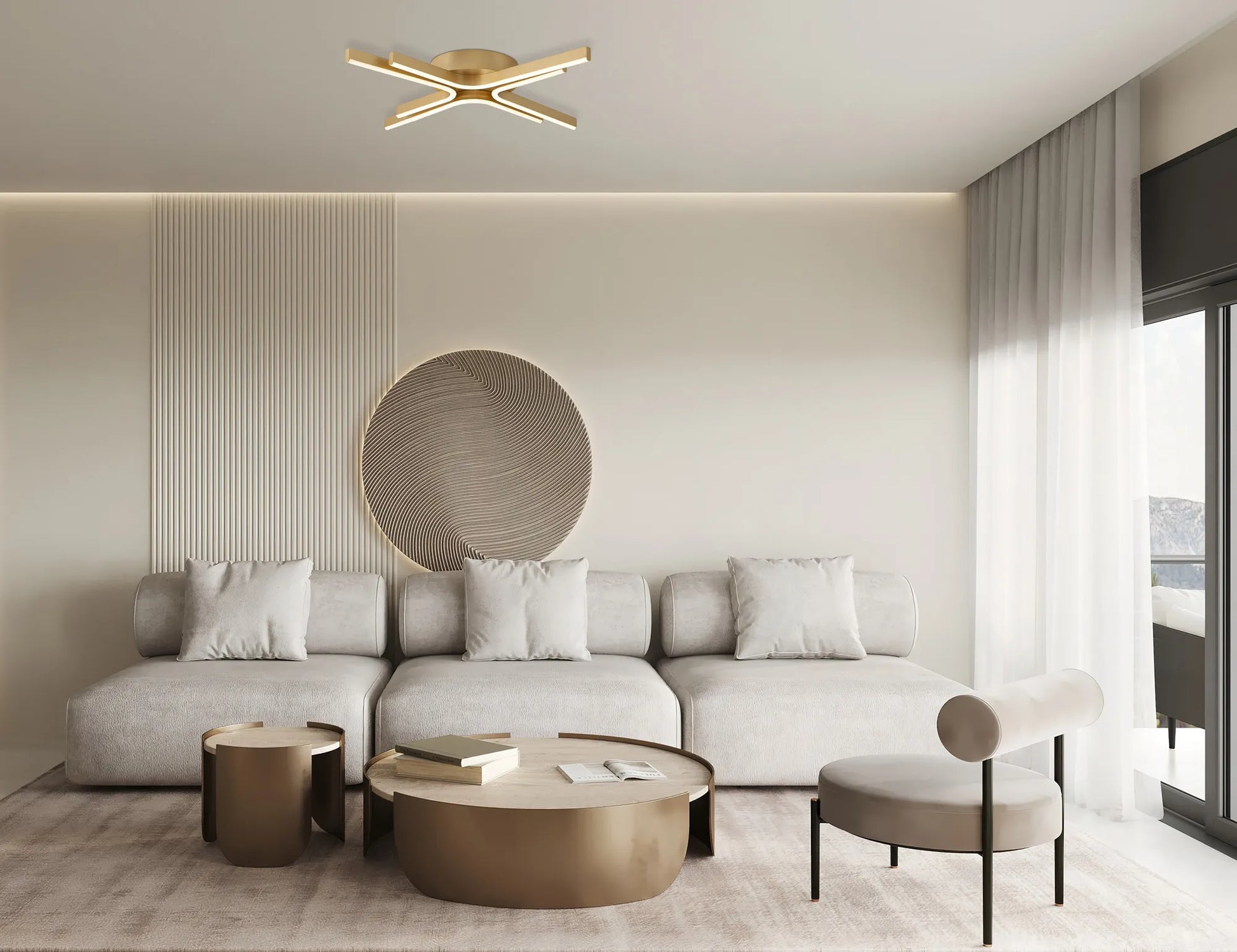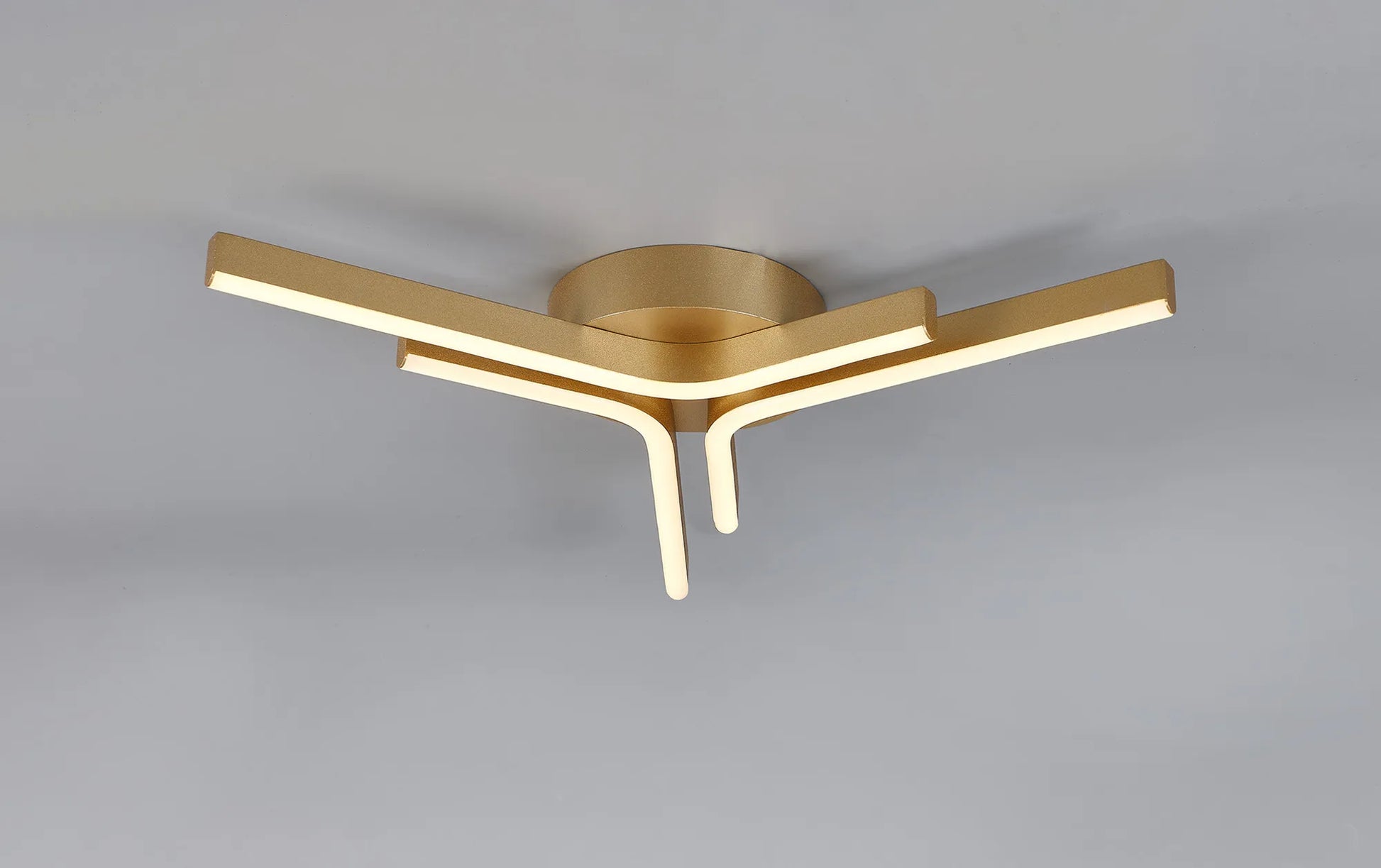 Nambucca is a collection of flush ceiling lights and is available in three or four arm vector configurations. The larger four arm fitting offers a CCT switchable function and remote control to conveniently adjust the amount of illumination required. Available in painted gold, sand black or sand white, these ceiling fixtures and complementing wall lamp offer an energy efficient range.