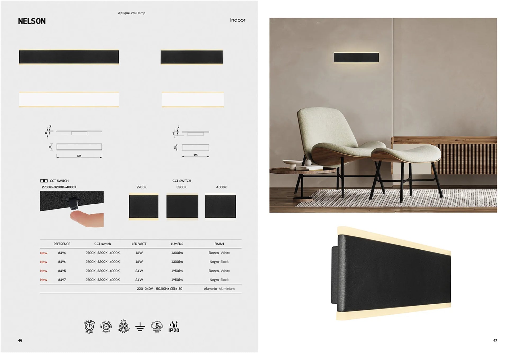 The Nelson wall light range is available in a black or white colour finish. It is powered by efficient LED technology with a CCT switching function to ensure your lighting requirements are met. These wall lamps are a sleek, modern, rectangular design with the integral LED strips on the top and bottom of the metal framework. Nelson is available in two sizes either a 16W or 24W.
