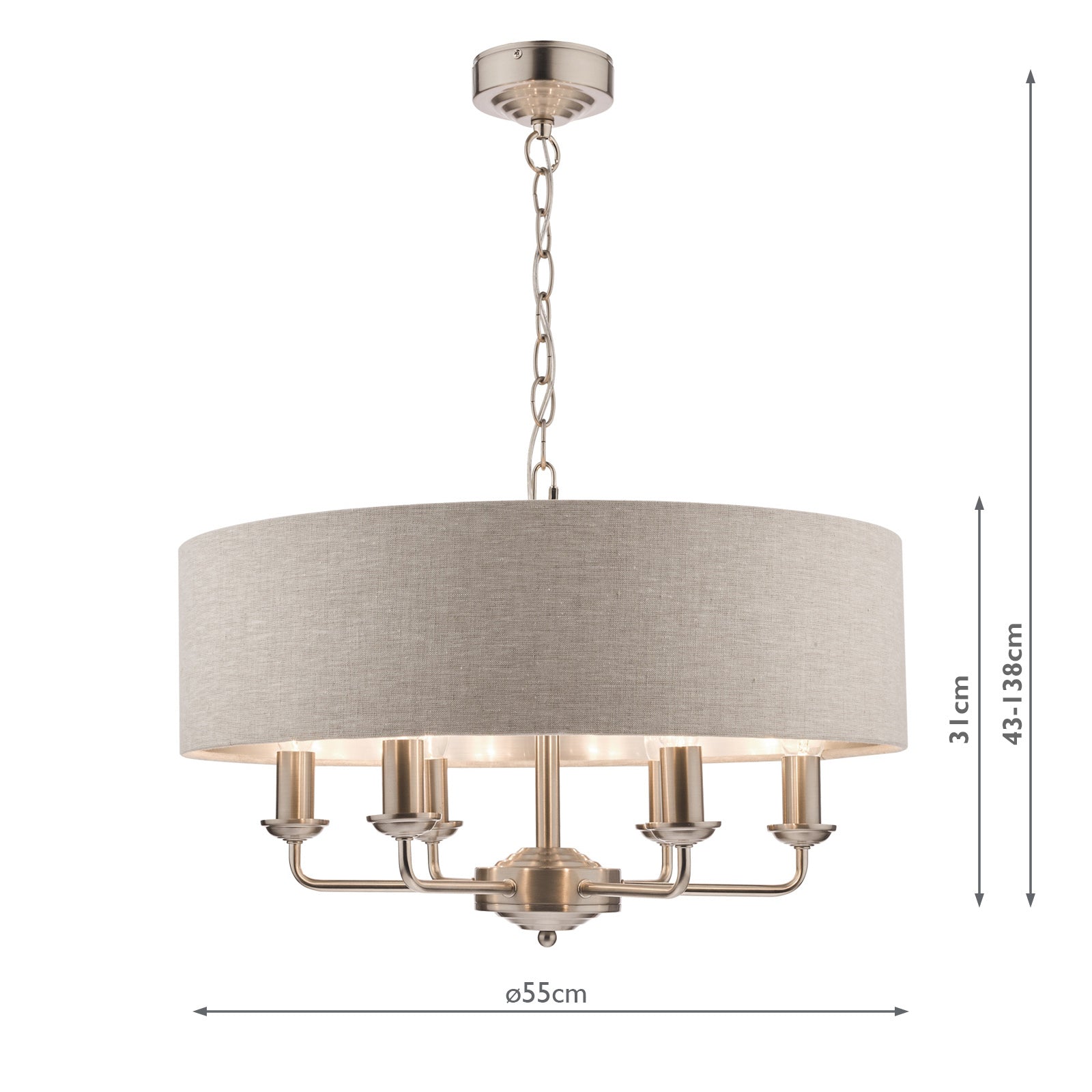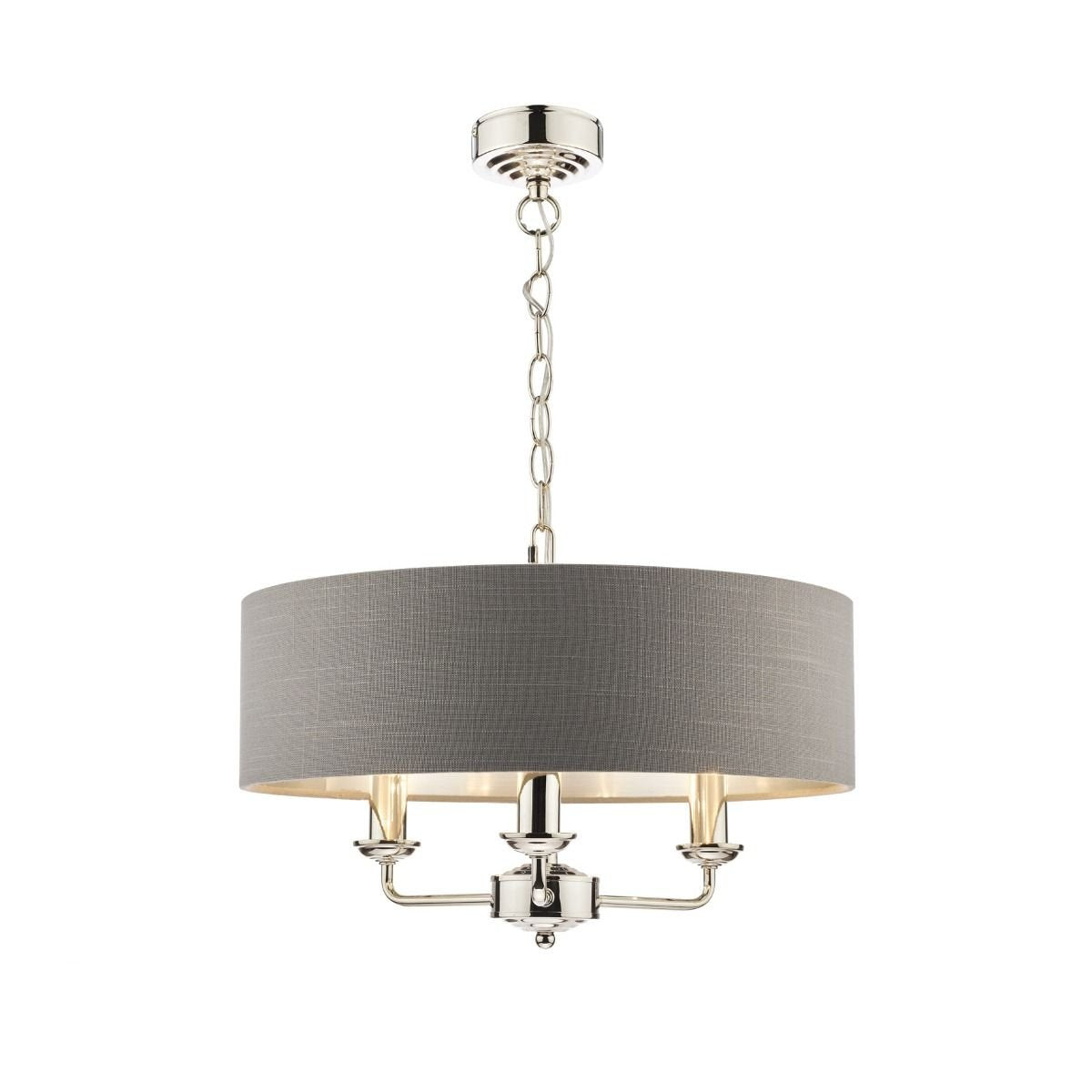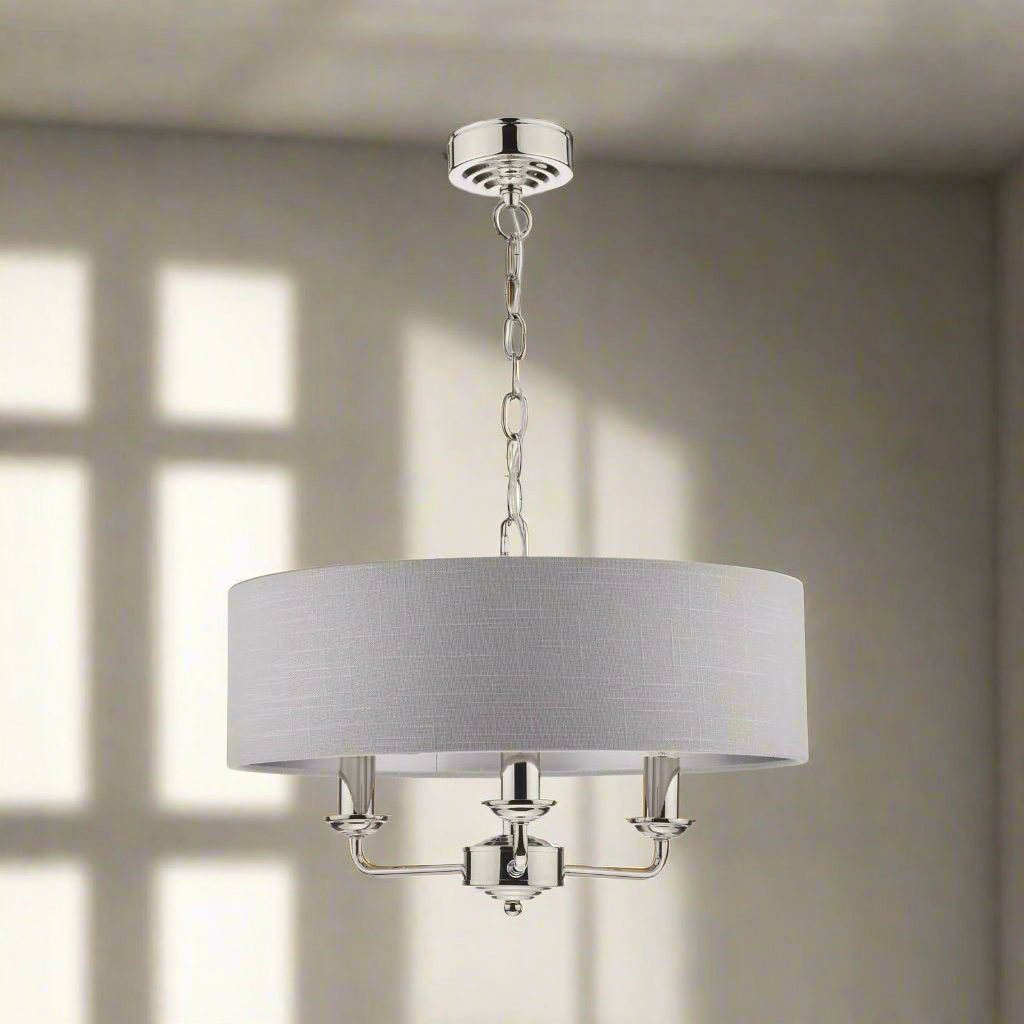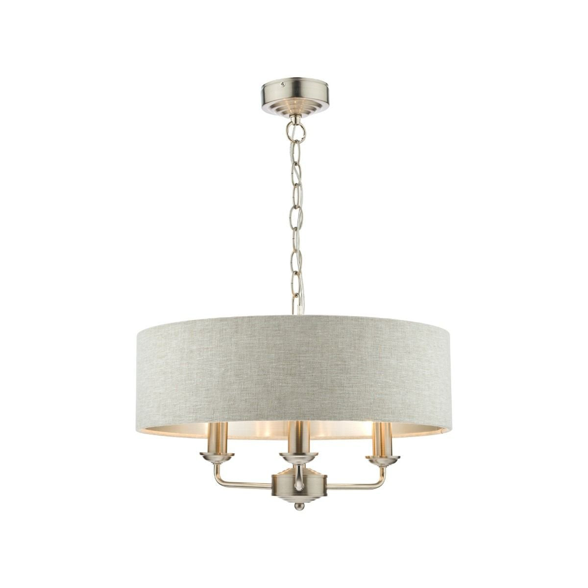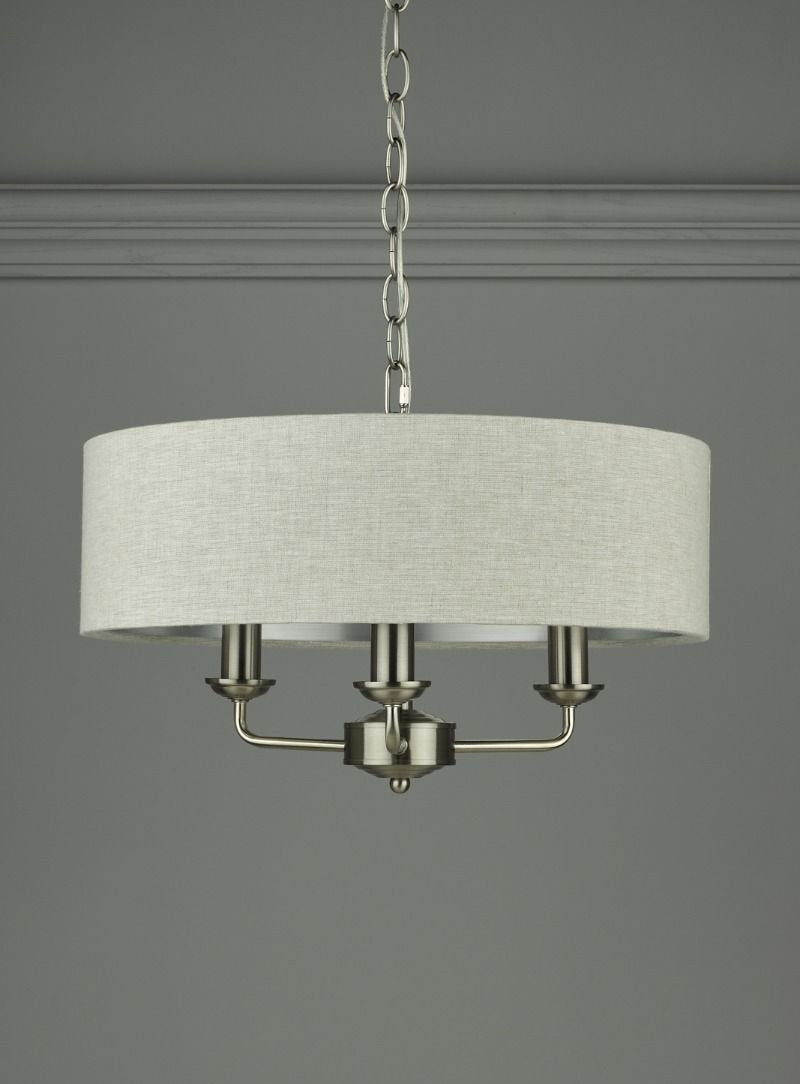 Chic and on-trend, the attractive Sorrento ceiling light from boasts three lights on arms, all encased in a single contemporary drum shade in natural slubbed linen with a metallic silver inner. A hanging chain falls from a round, Art Deco style, stepped ceiling rose. This 3 light pendant ceiling fitting comes in a velvety satin nickel, adding grown-up atmosphere to your dining or living area. Height is adjustable at the point of installation (40-85cm).