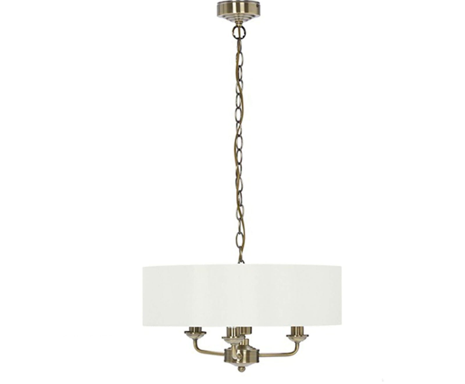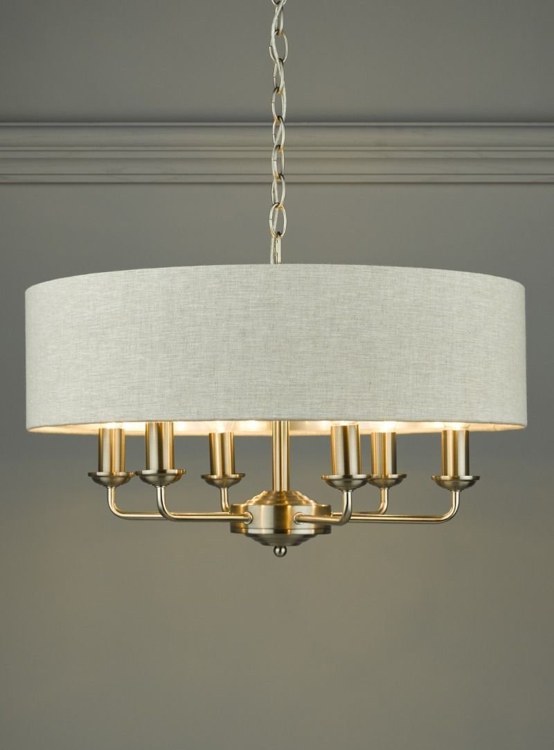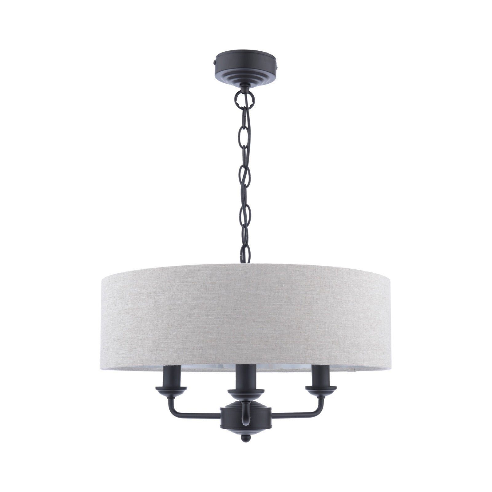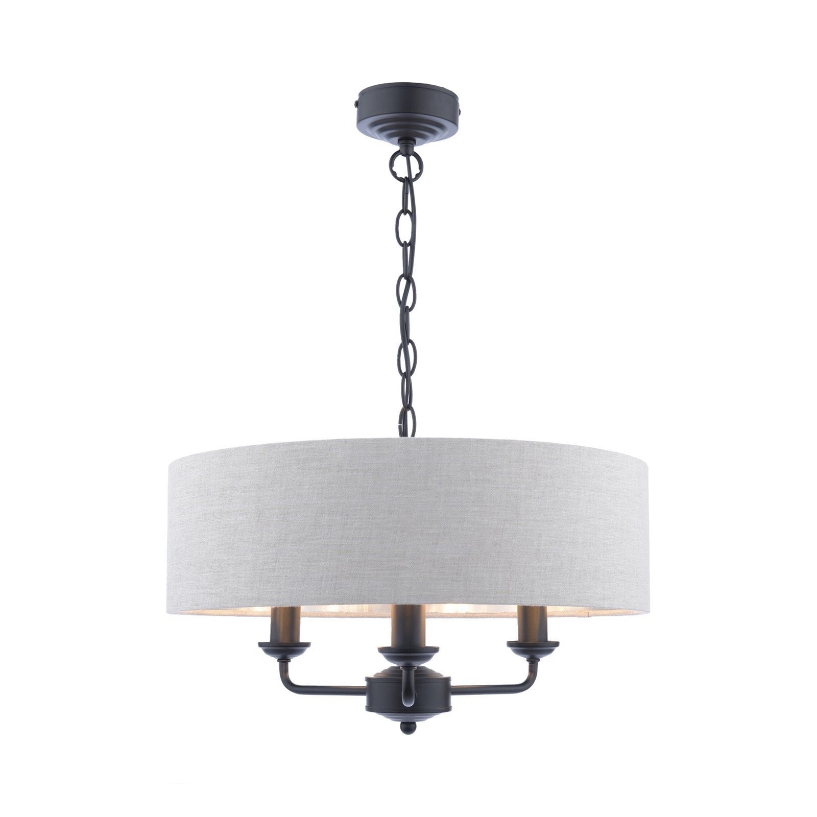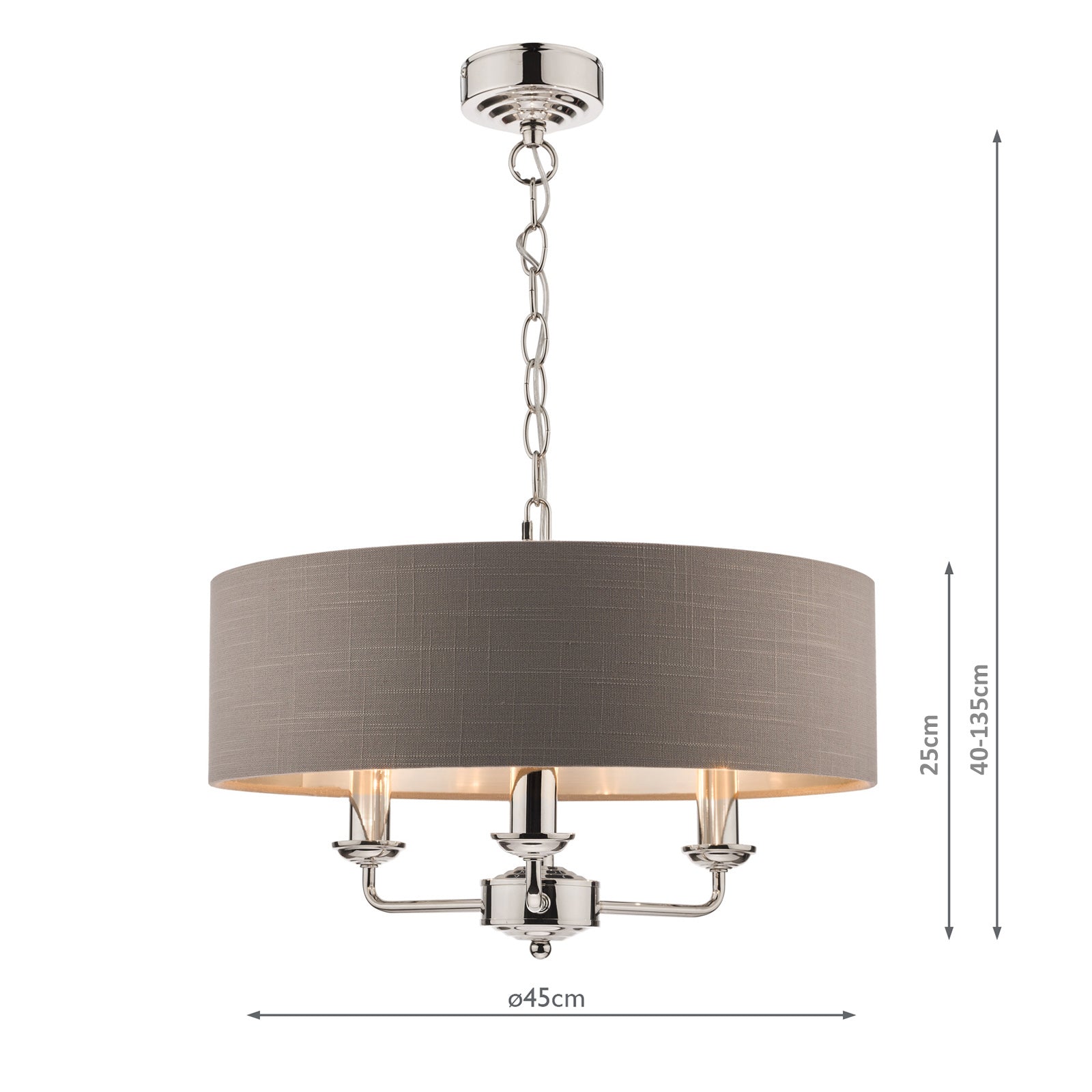 Chic and on-trend, the attractive Sorrento ceiling light from boasts three lights on arms, all encased in a single contemporary drum shade in natural slubbed linen with a metallic silver inner. A hanging chain falls from a round, Art Deco style, stepped ceiling rose. This 3 light pendant ceiling fitting comes in a velvety satin nickel, adding grown-up atmosphere to your dining or living area. Height is adjustable at the point of installation (40-85cm).