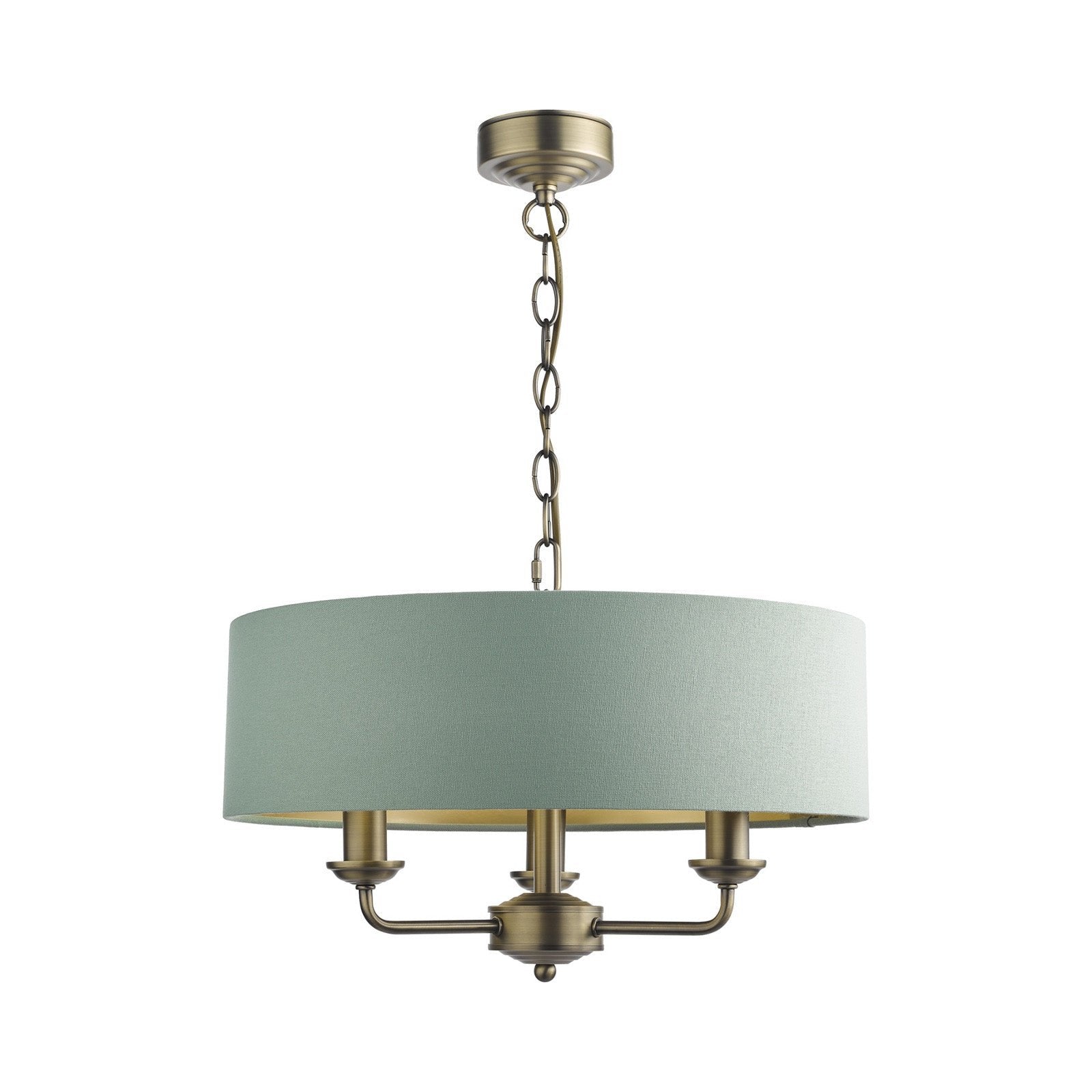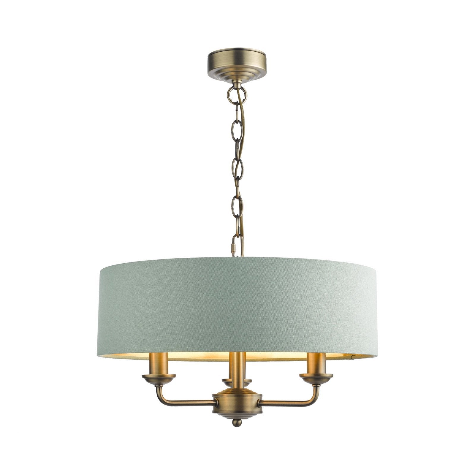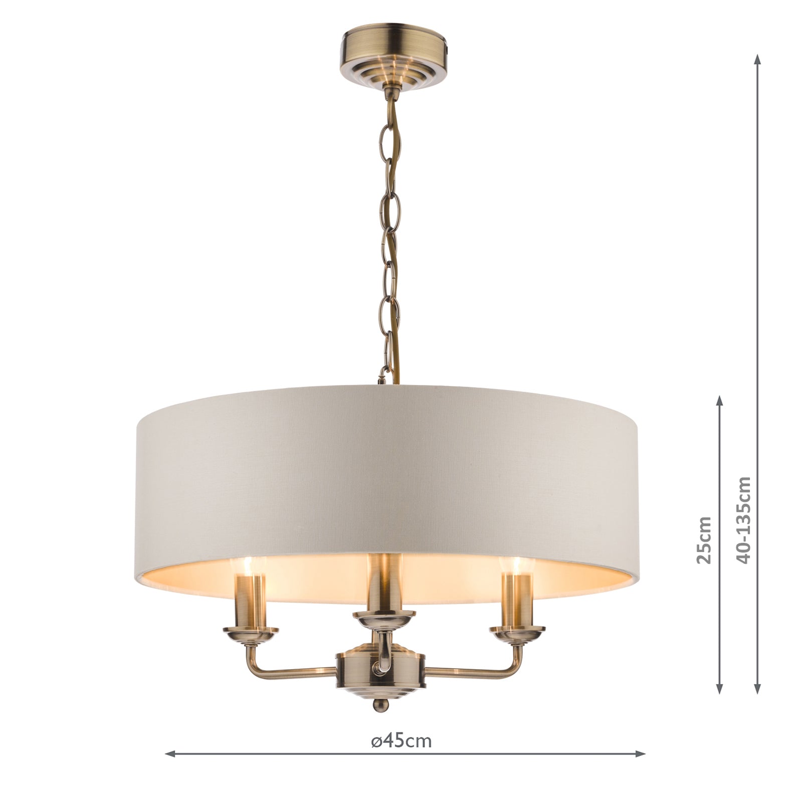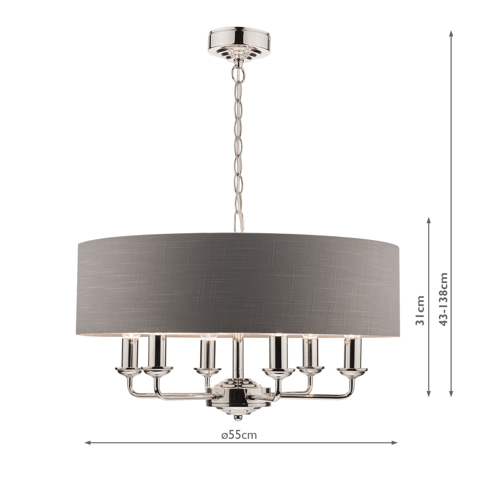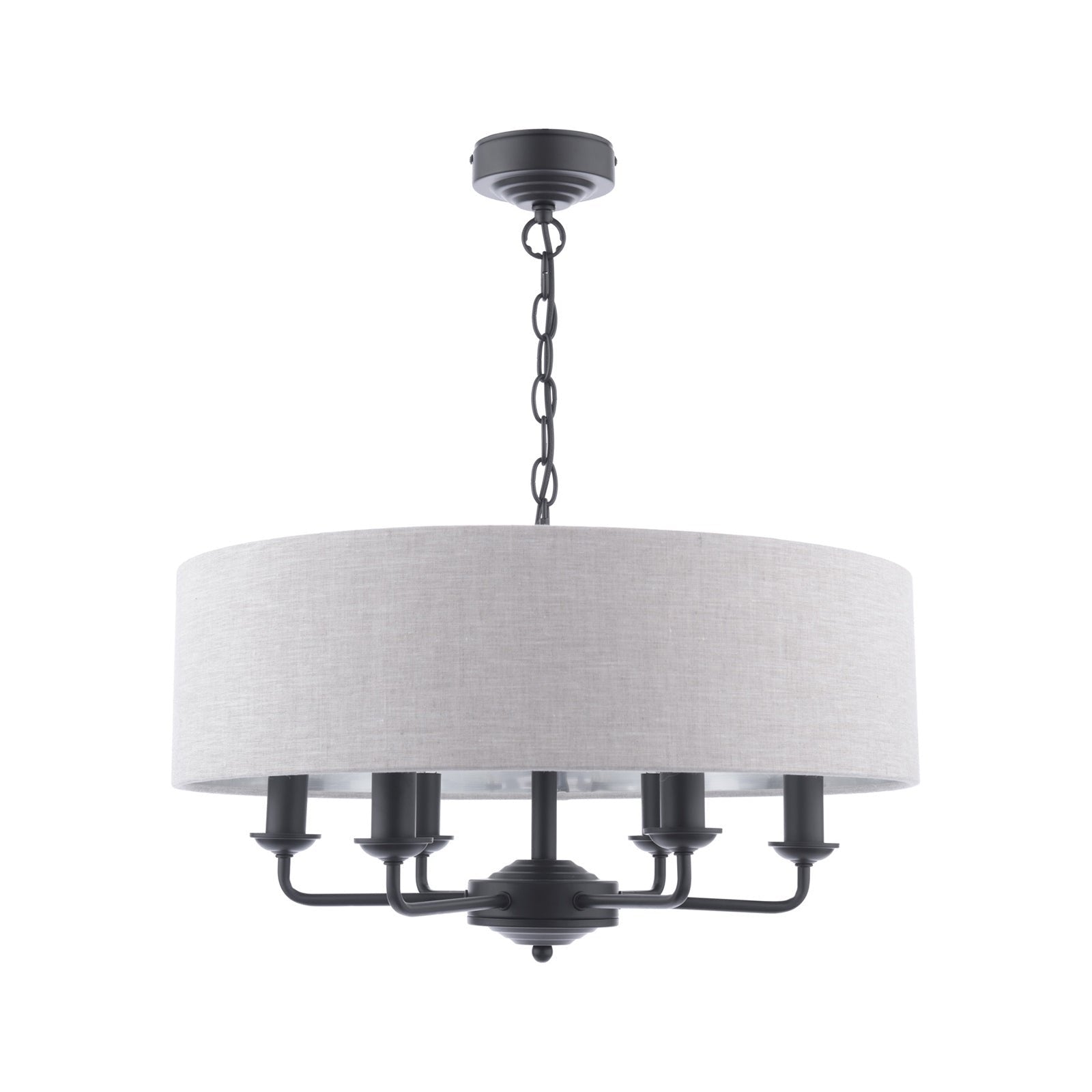 Chic and on-trend, the attractive Sorrento ceiling light from boasts three lights on arms, all encased in a single contemporary drum shade in natural slubbed linen with a metallic silver inner. A hanging chain falls from a round, Art Deco style, stepped ceiling rose. This 3 light pendant ceiling fitting comes in a velvety satin nickel, adding grown-up atmosphere to your dining or living area. Height is adjustable at the point of installation (40-85cm).