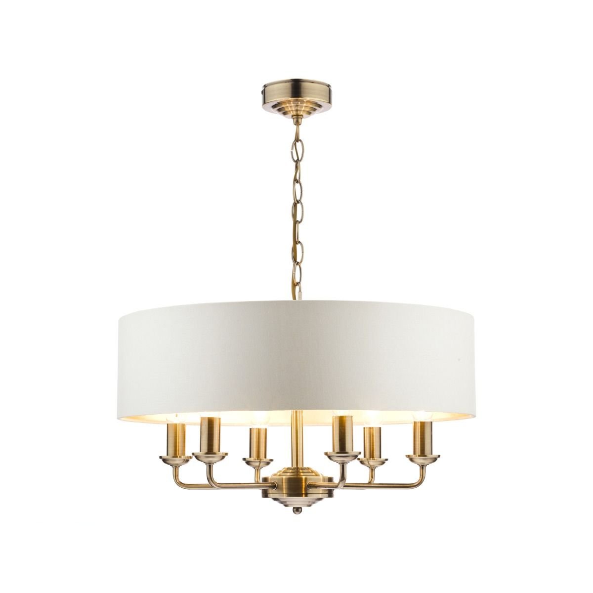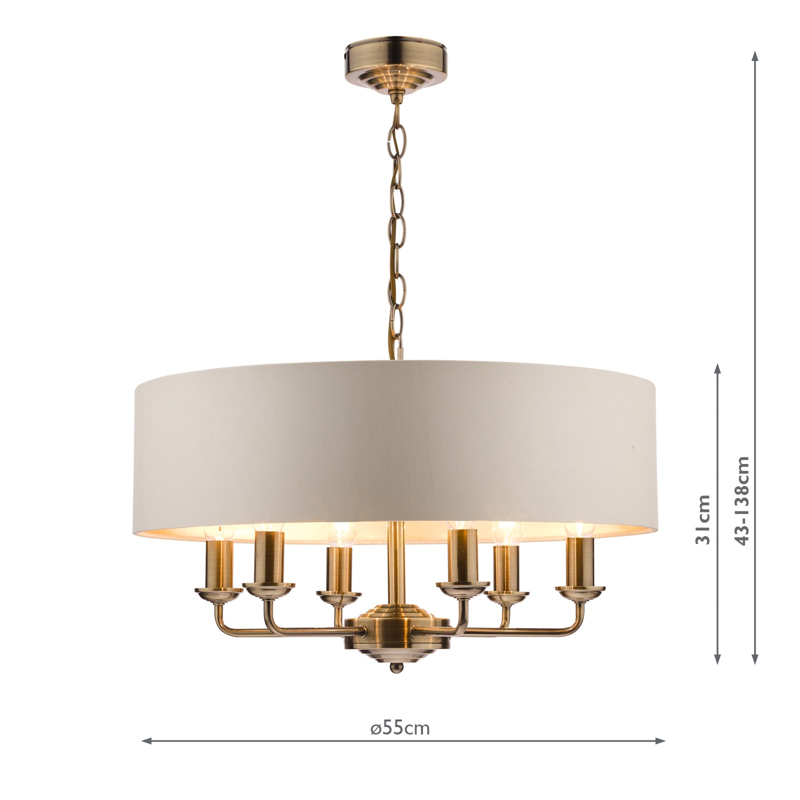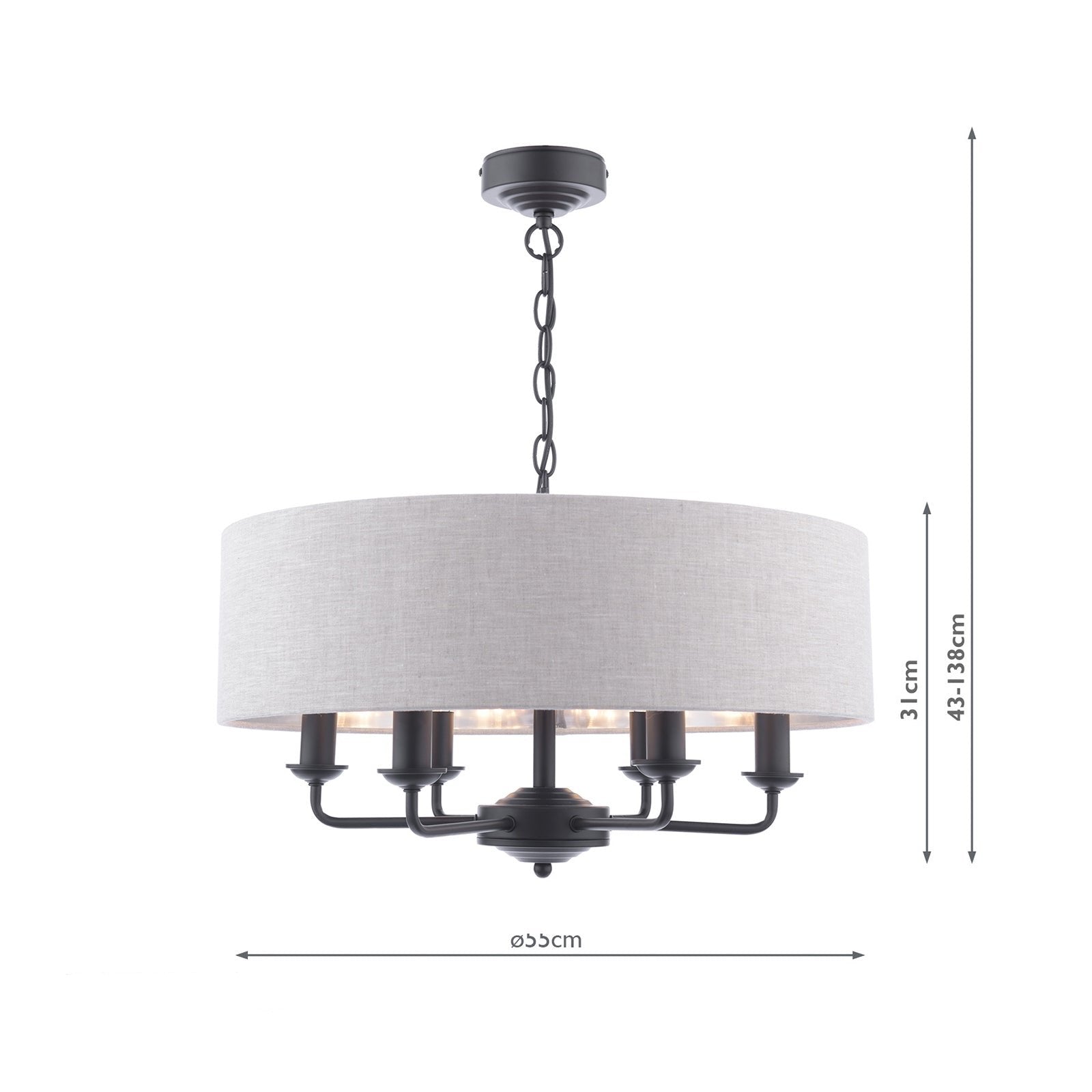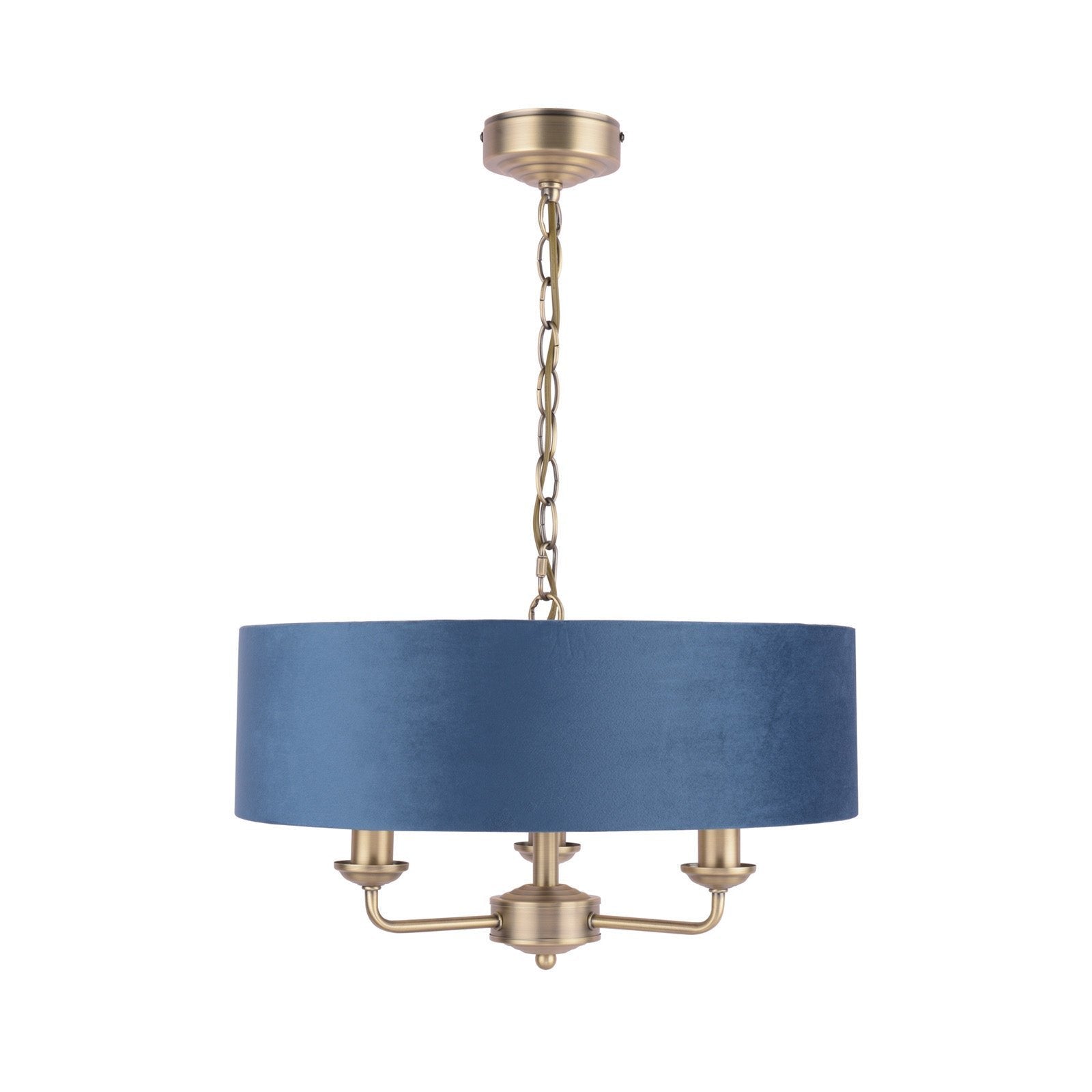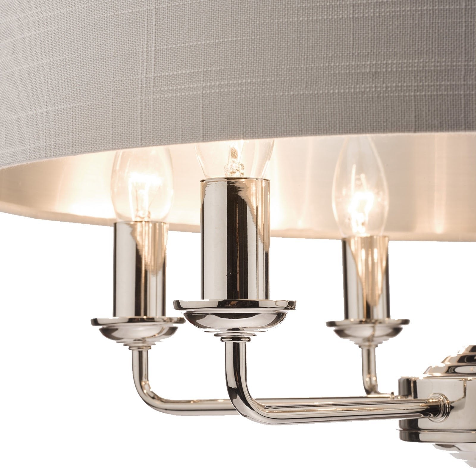 Chic and on-trend, the attractive Sorrento ceiling light from boasts three lights on arms, all encased in a single contemporary drum shade in natural slubbed linen with a metallic silver inner. A hanging chain falls from a round, Art Deco style, stepped ceiling rose. This 3 light pendant ceiling fitting comes in a velvety satin nickel, adding grown-up atmosphere to your dining or living area. Height is adjustable at the point of installation (40-85cm).