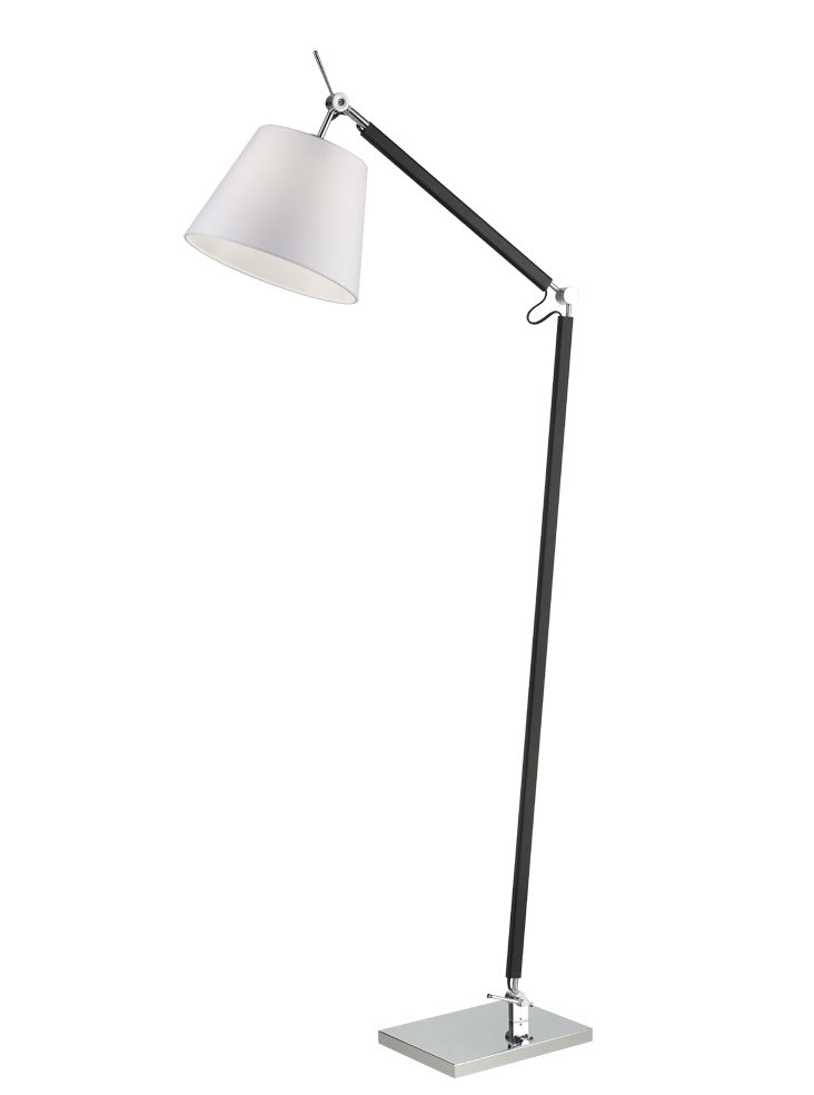 In black finish with chrome metalwork and an off-white fabric shade. There is a switch on the lampholder.