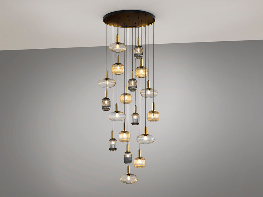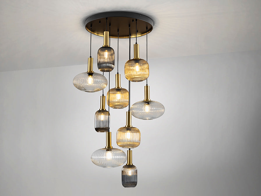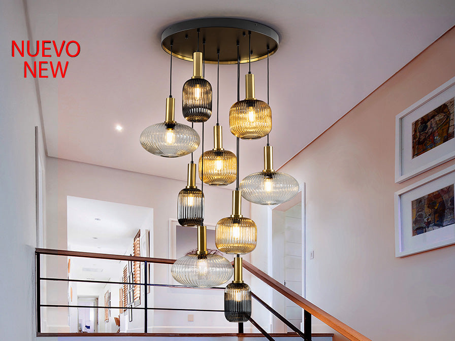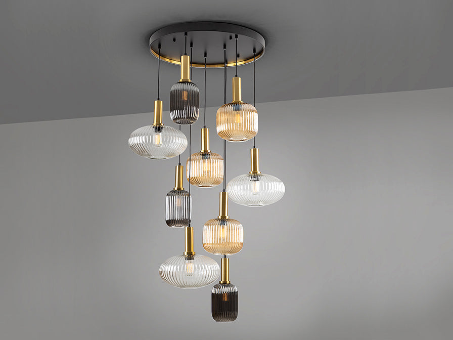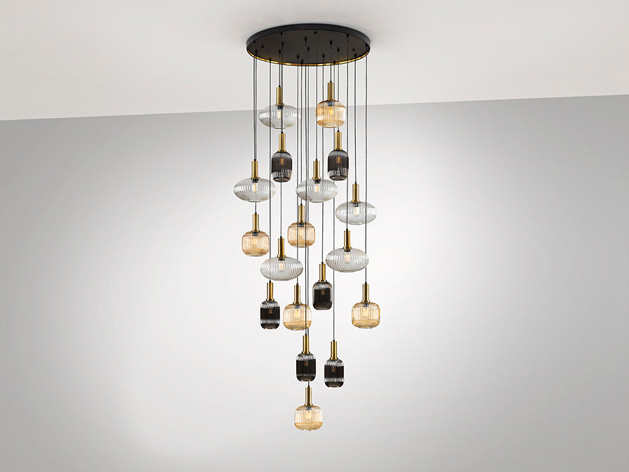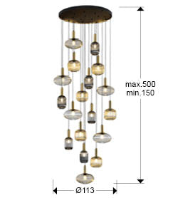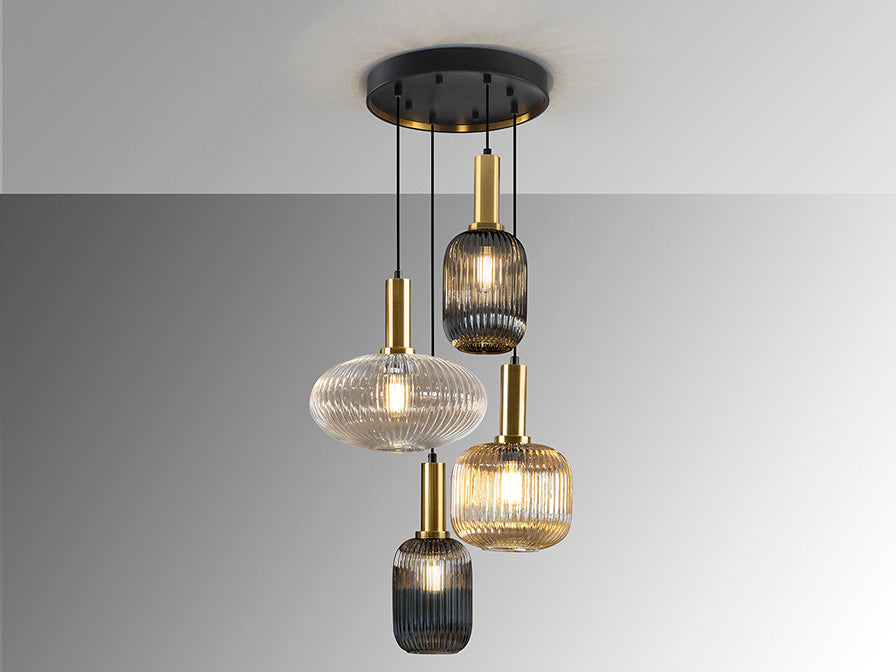 Lamp of 4 lights made of metal, finished in matt black, with details of satin brass. Molded glass shades in clear, amber and shimmered smoked grey finish. Adjustable in length.
