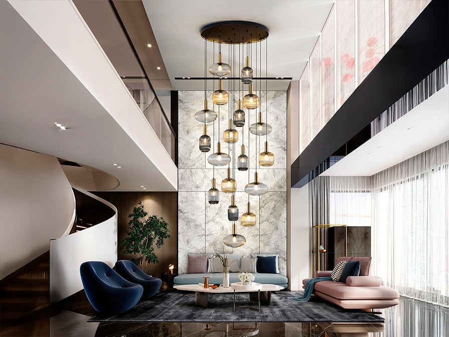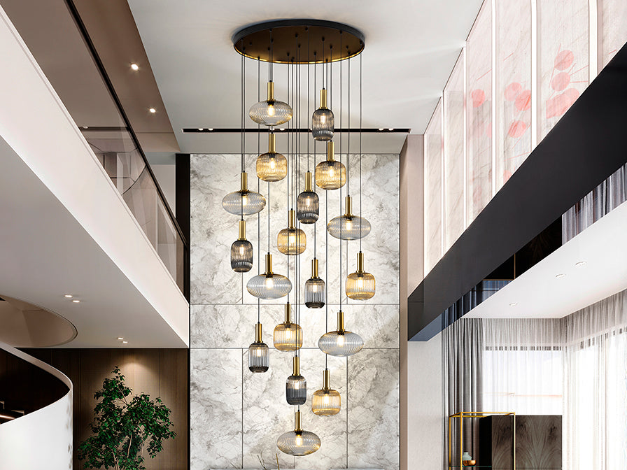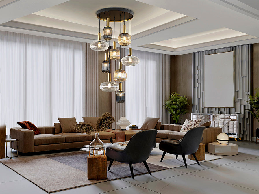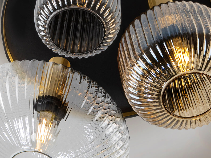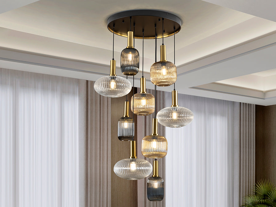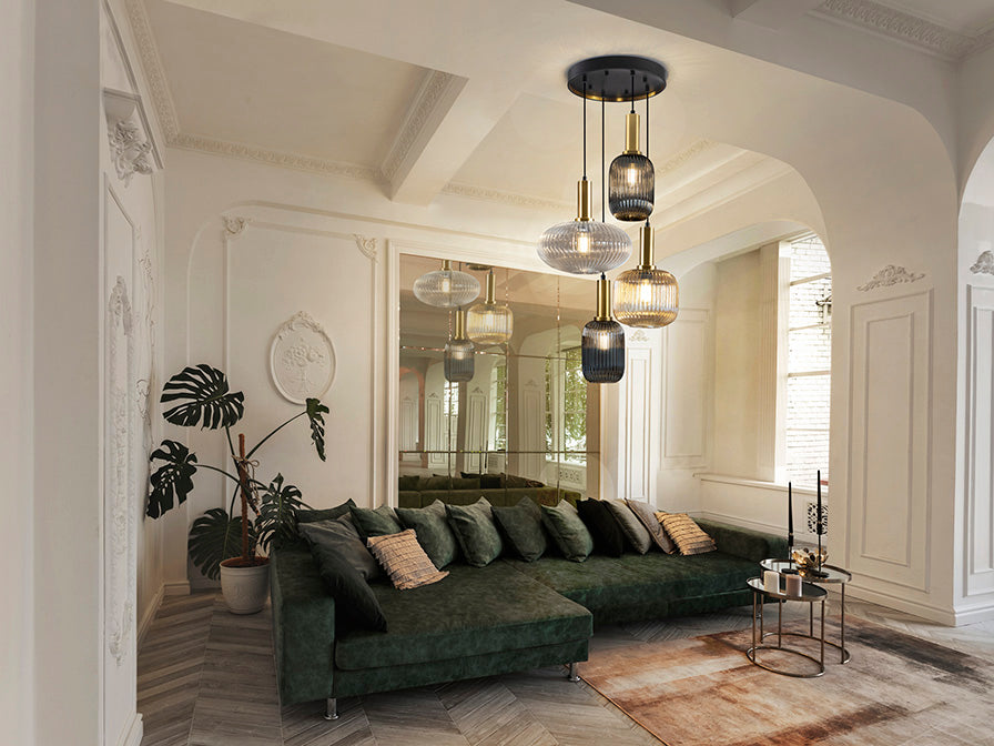 Lamp of 4 lights made of metal, finished in matt black, with details of satin brass. Molded glass shades in clear, amber and shimmered smoked grey finish. Adjustable in length.