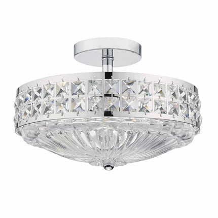 OLONA takes the traditional crystal ceiling flush and updates it with beautiful sparkling square faceted crystal beads mounted in an antique brass frame with a decorative clear glass diffuser. With a generous 3 x e14 lamps this compact flush gives out a great light for its size.