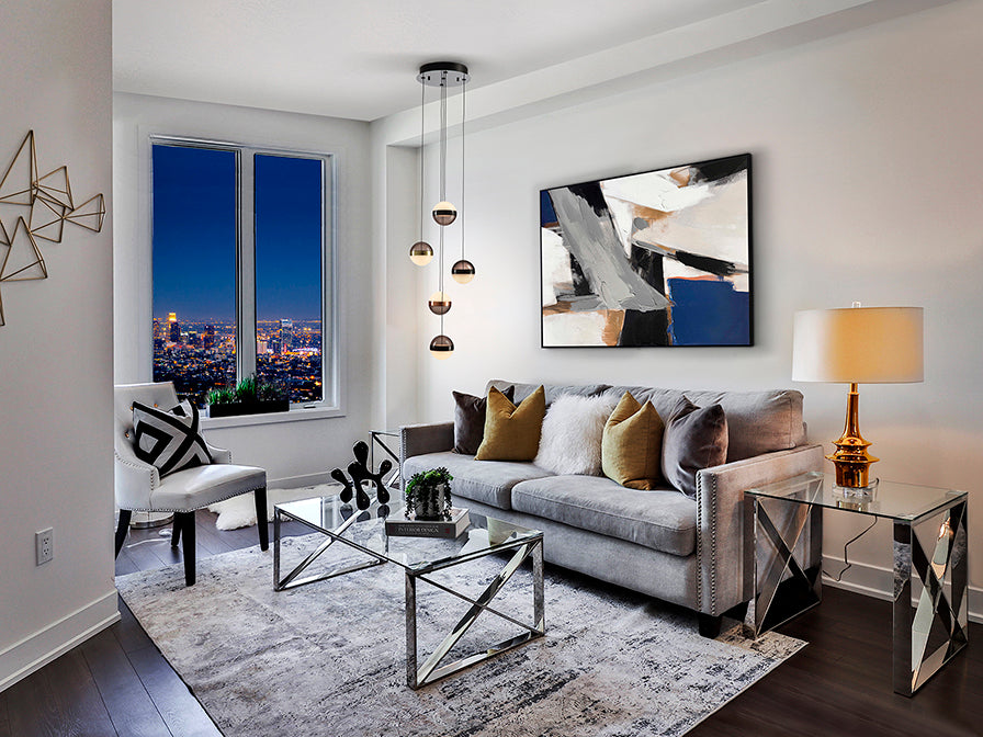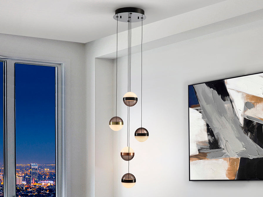 Lamp of 5 LED lights, made of metal, finished in black. Shades of Ø12 cm of smoke polycarbonate and marbled glass, with metal rings finished in copper and satin brass. DIMMABLE. 36W LED. 3000K. 1671 lm.