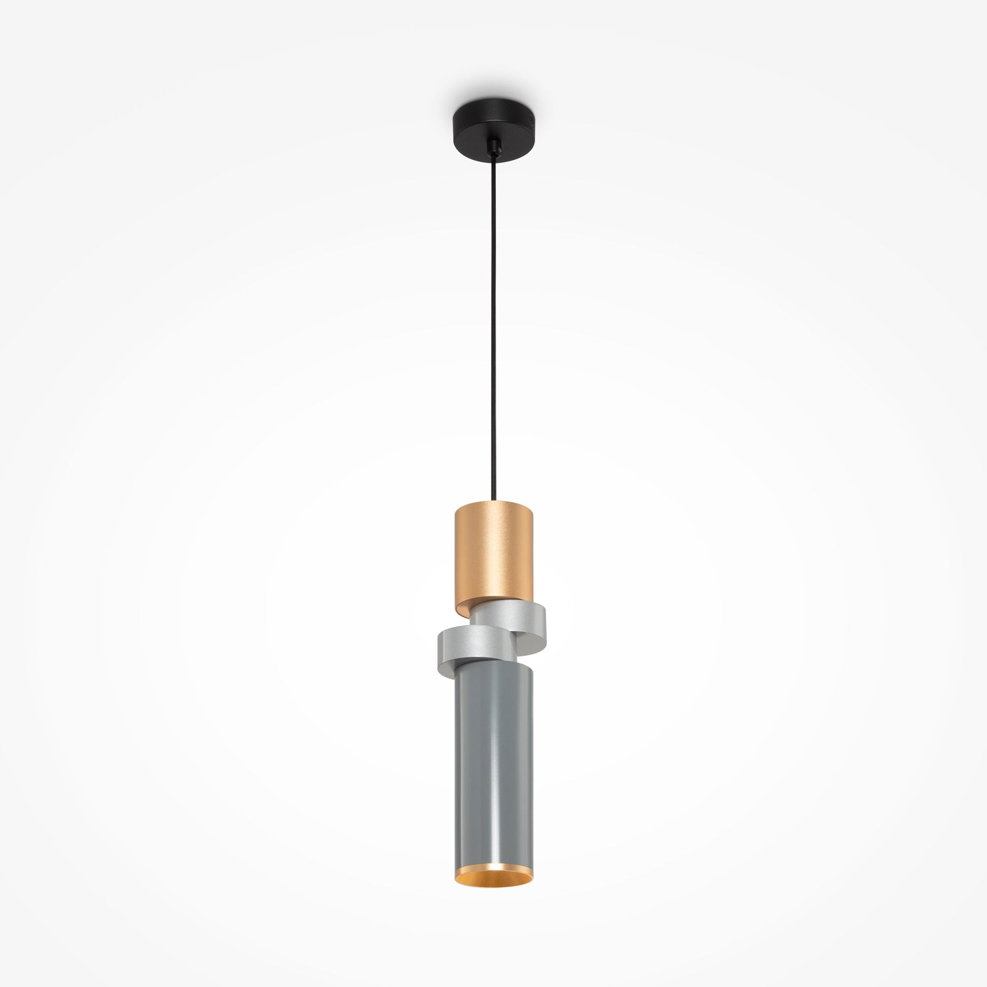 Metal fittings combine grey, gold and silver color. Combination of cylindrical shapes in design. Height is adjustable using cable. Light source — lamp with GU10 base.