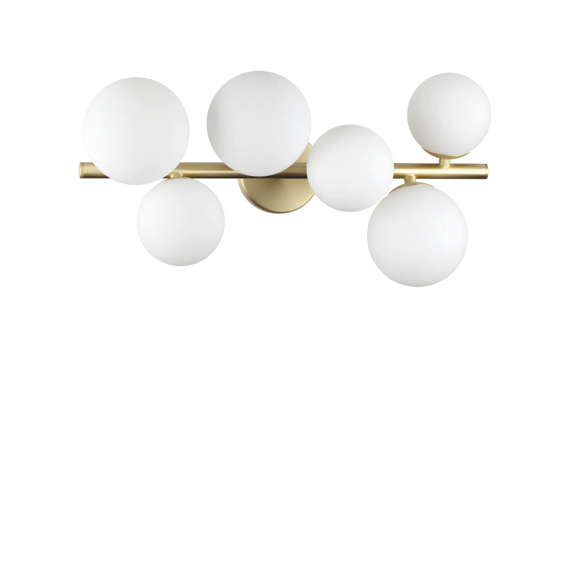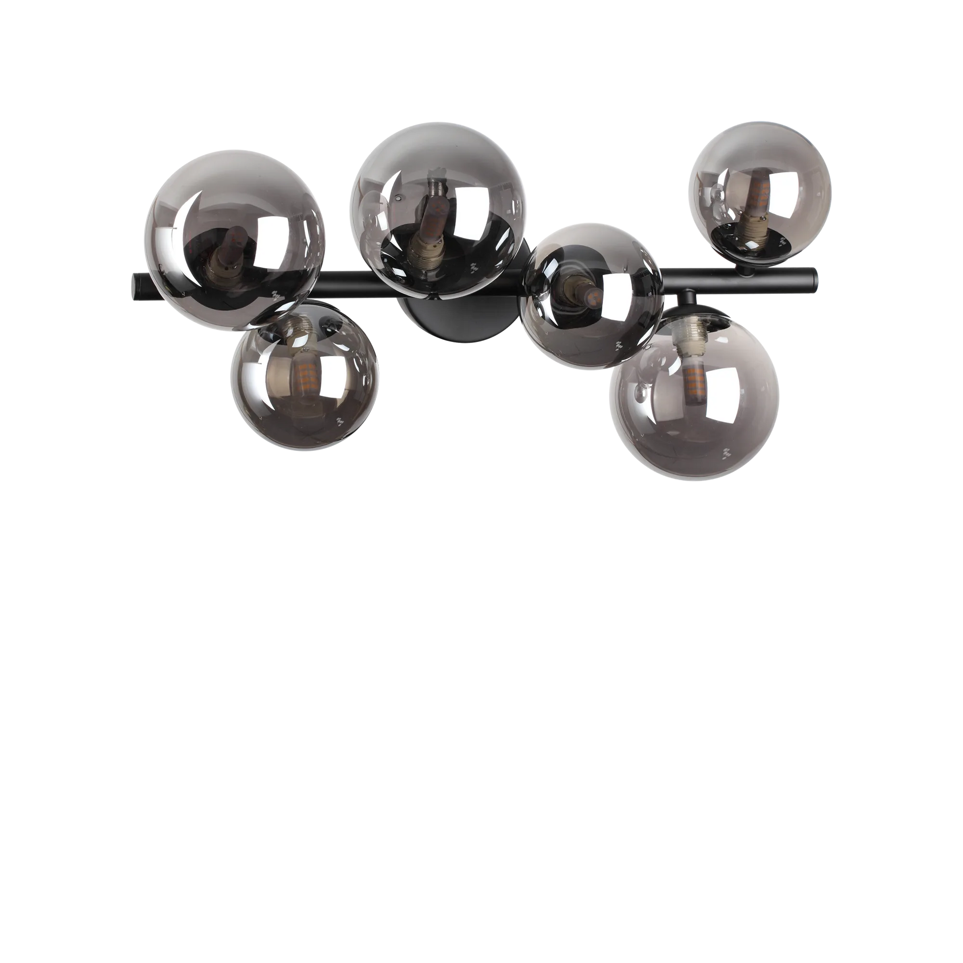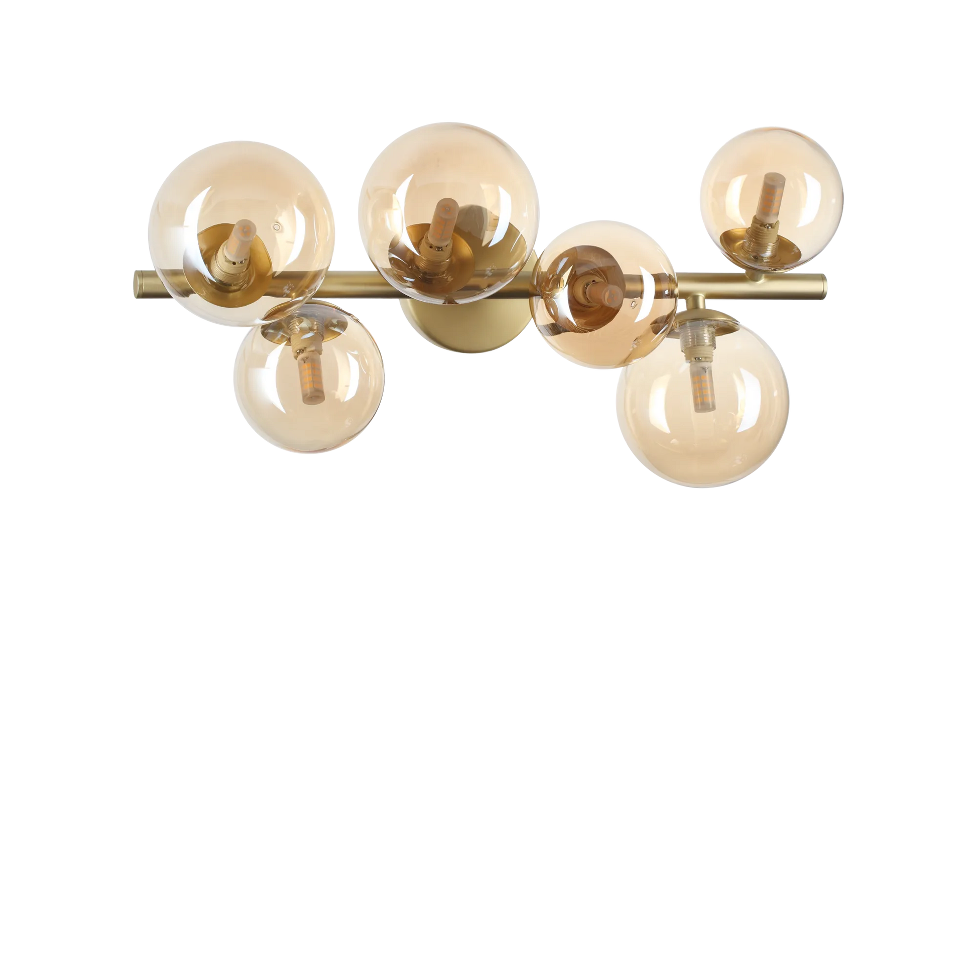 Metal frame with linear structure with round section or circular with square section. Blown glass diffusers. Finishes: matt black with amber or fume' pyrex glass or satin brass with acid-etched white glass.