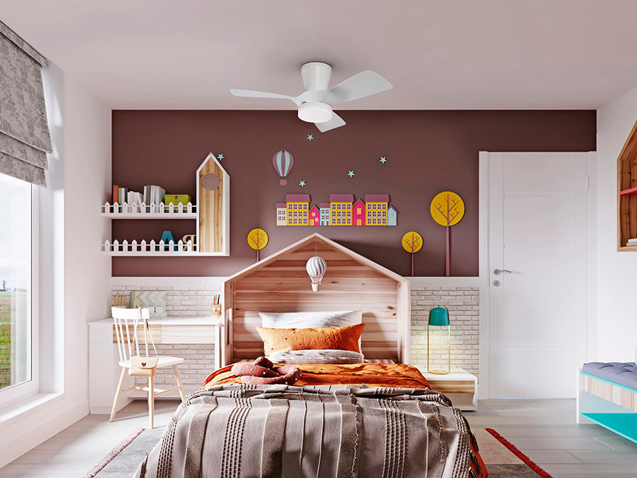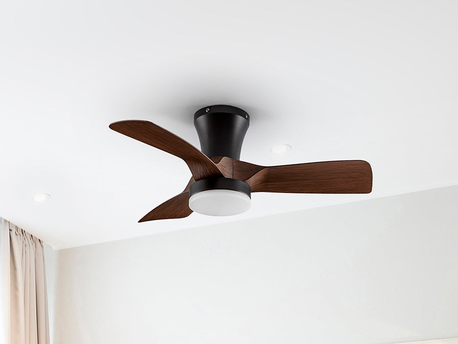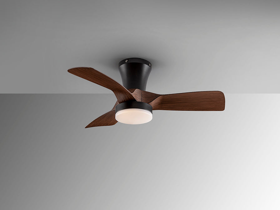 Ceiling fan with DIMMABLE LED light and CCT (adjustable light temperature). Made of metal and acrylic blades. Opal acrylic diffuser. DC motor, 6 speeds and reverse. Timer, breeze and memory function. D Remote control included. 22W LED, 1200 lm, 3000-4000-5000 K...110v version available.