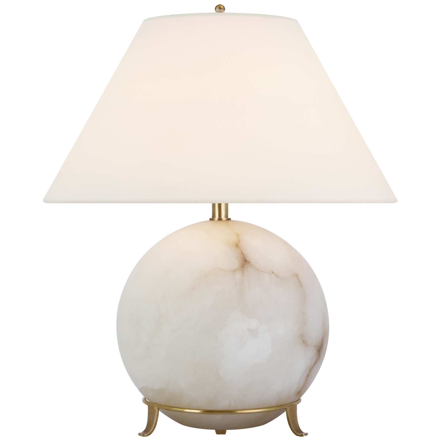 The Price Table Lamp by Marie Flanigan exudes elegance in a simple, bold design. The base features an alabaster stone orb supported by antique brass detailing and capped with a sophisticated linen shade. The lamp will accent any surface, alone or in multiples, and add ideal illumination to a living room or office.