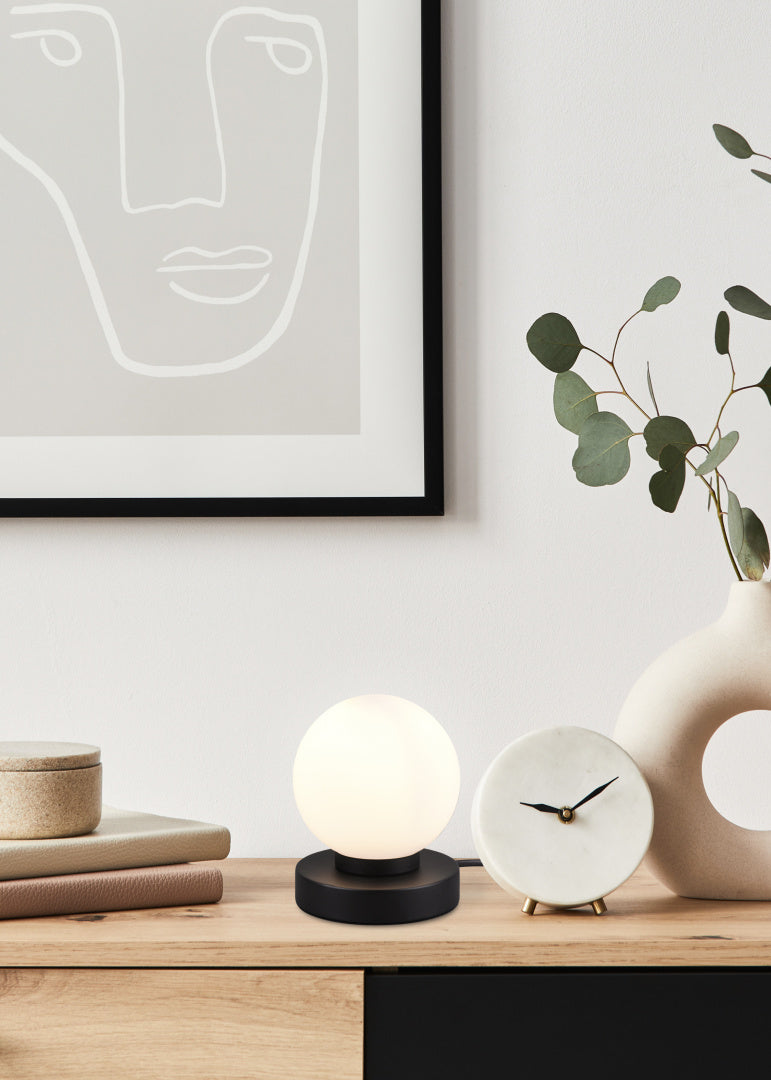 The PRINZ II table lamp impresses with its simple design and functionality. A pleasant light is emitted through the small glass. A practical feature is the integrated ON/OFF touch function, which allows you to adjust the brightness of the lamp to your needs. The lamp has a white glass shade and the base is in black matt. For energy-saving lighting, it is recommended to use an LED illuminant. These are an optimal alternative to conventional halogen lamps and stand for a high quality of light and energy savings of up to 80%. In addition, LED lamps help you benefit from a long service life, low heat generation and at the same time protect the environment.