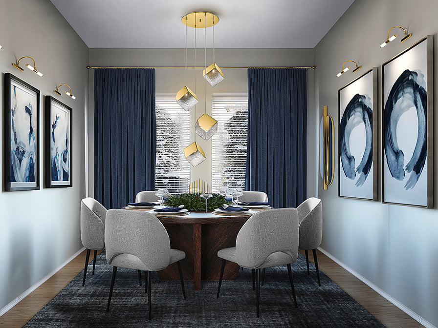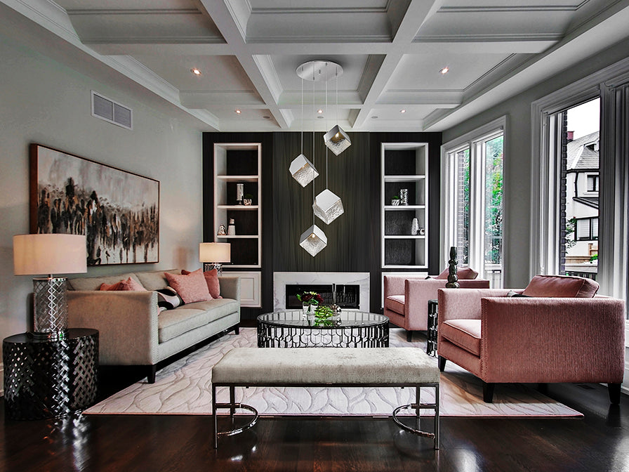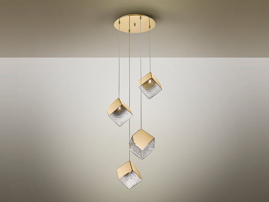 Round lamp of 4 lights, made of metal and steel finished in gold. Cubic shade of textured glass. Adjustable in height.