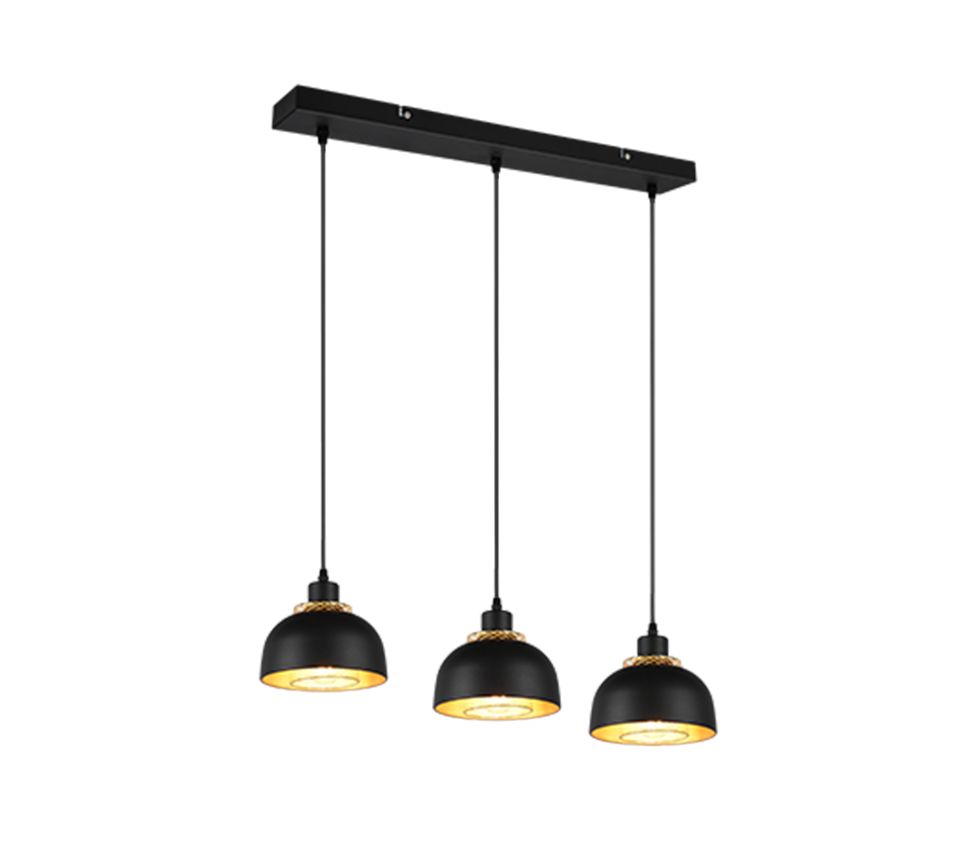 The three-light pendant luminaire of the PUNCH series convinces with its industrial look and fits perfectly into modern, puristic furnishing styles in your kitchen or dining area. The large shades, each complemented on the inside by a second smaller shade in a lattice look as a design element, come into their own wonderfully and provide special lighting effects. The stylish shape and colour design of the luminaire in matt black and gold colours gives your own four walls an industrial ambience. For energy-saving lighting, it is recommended to use an LED illuminant. These are an optimal alternative to conventional halogen lamps and stand for a high quality of light and energy savings of up to 80%. In addition, LED lamps help you benefit from a long service life, low heat generation and at the same time protect the environment.