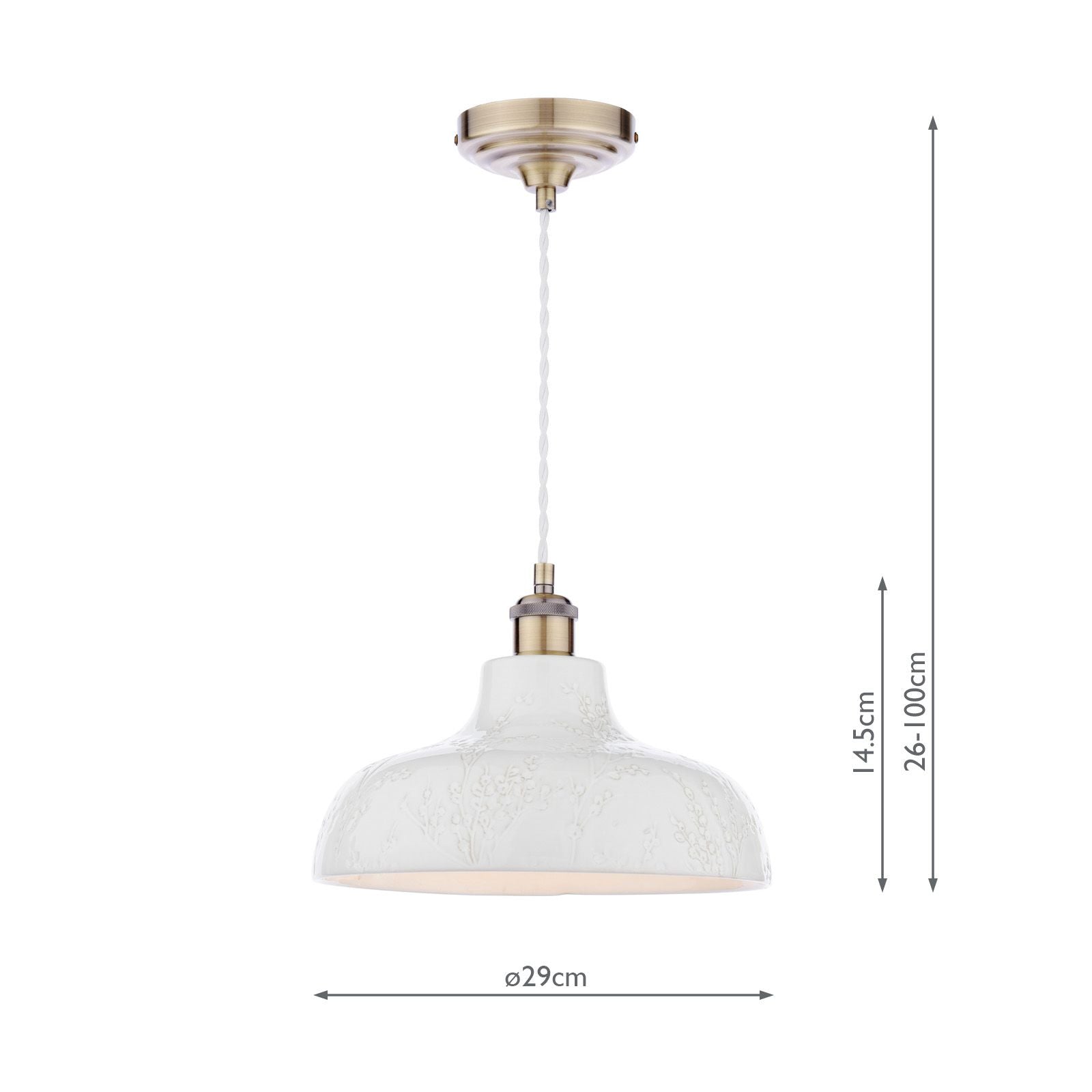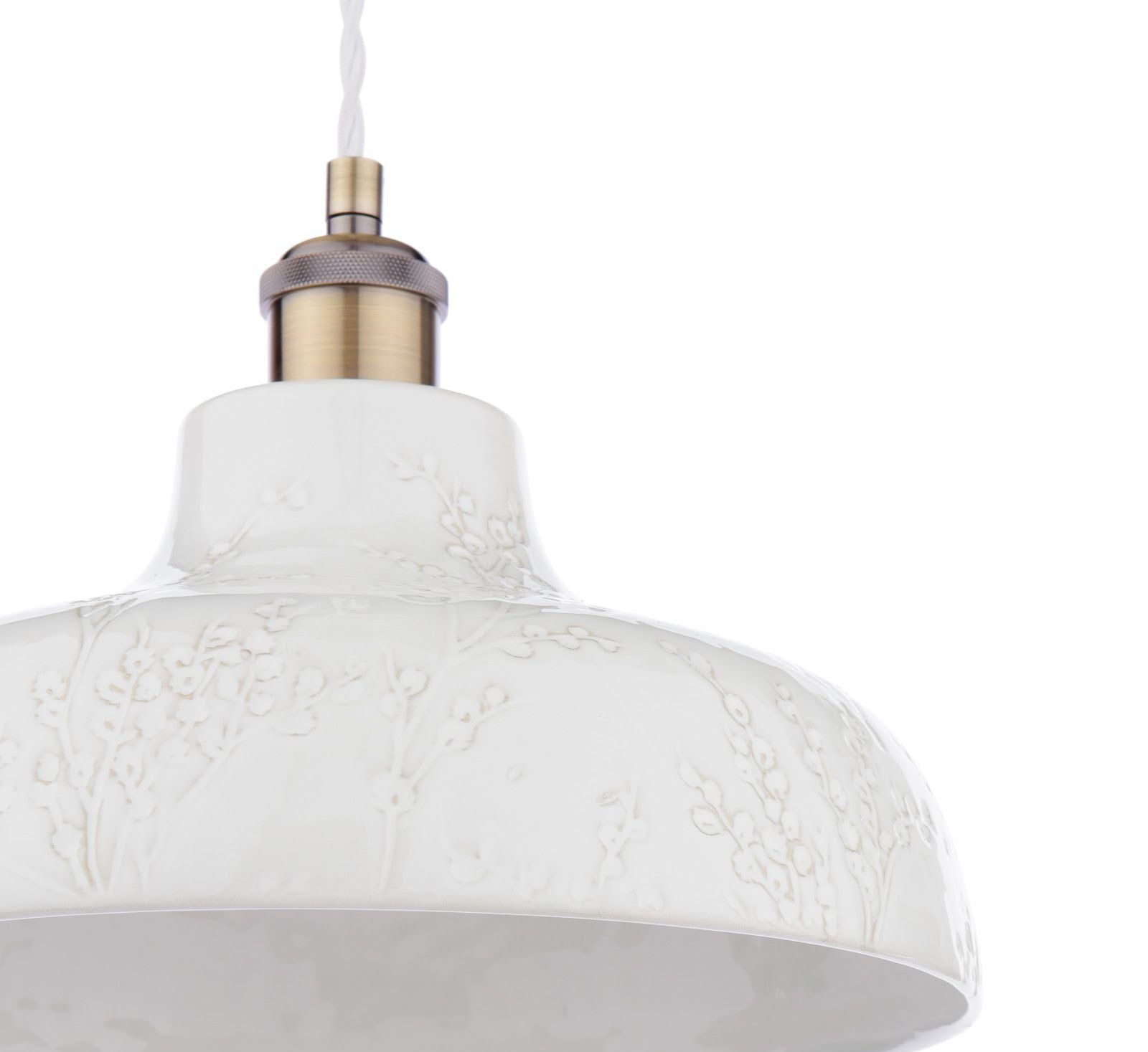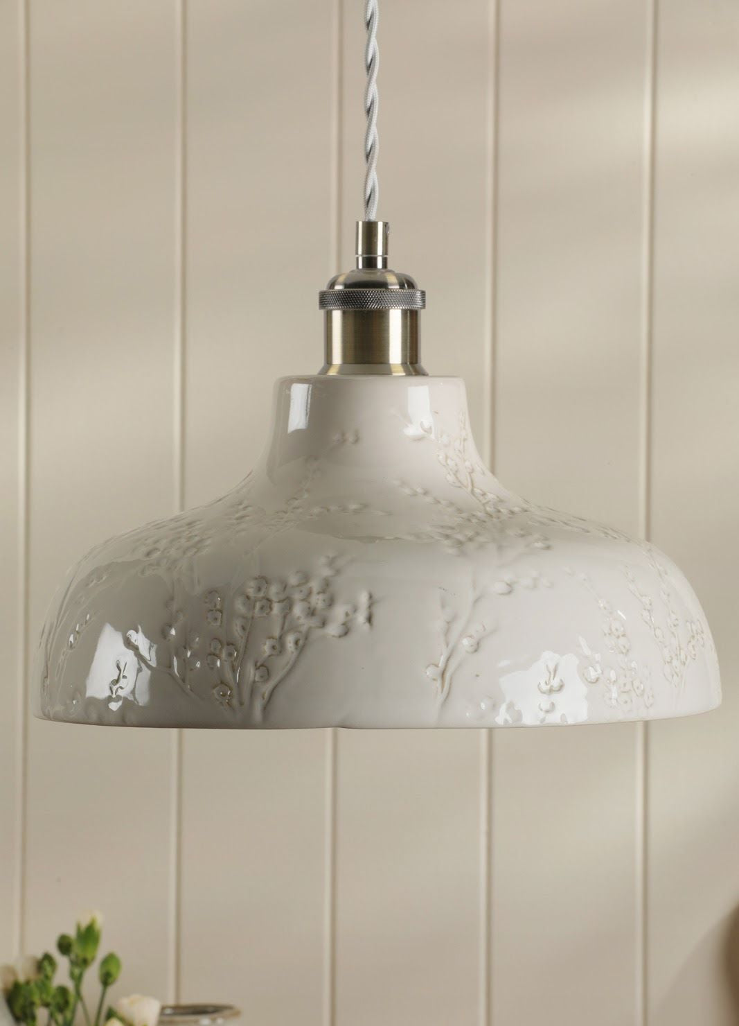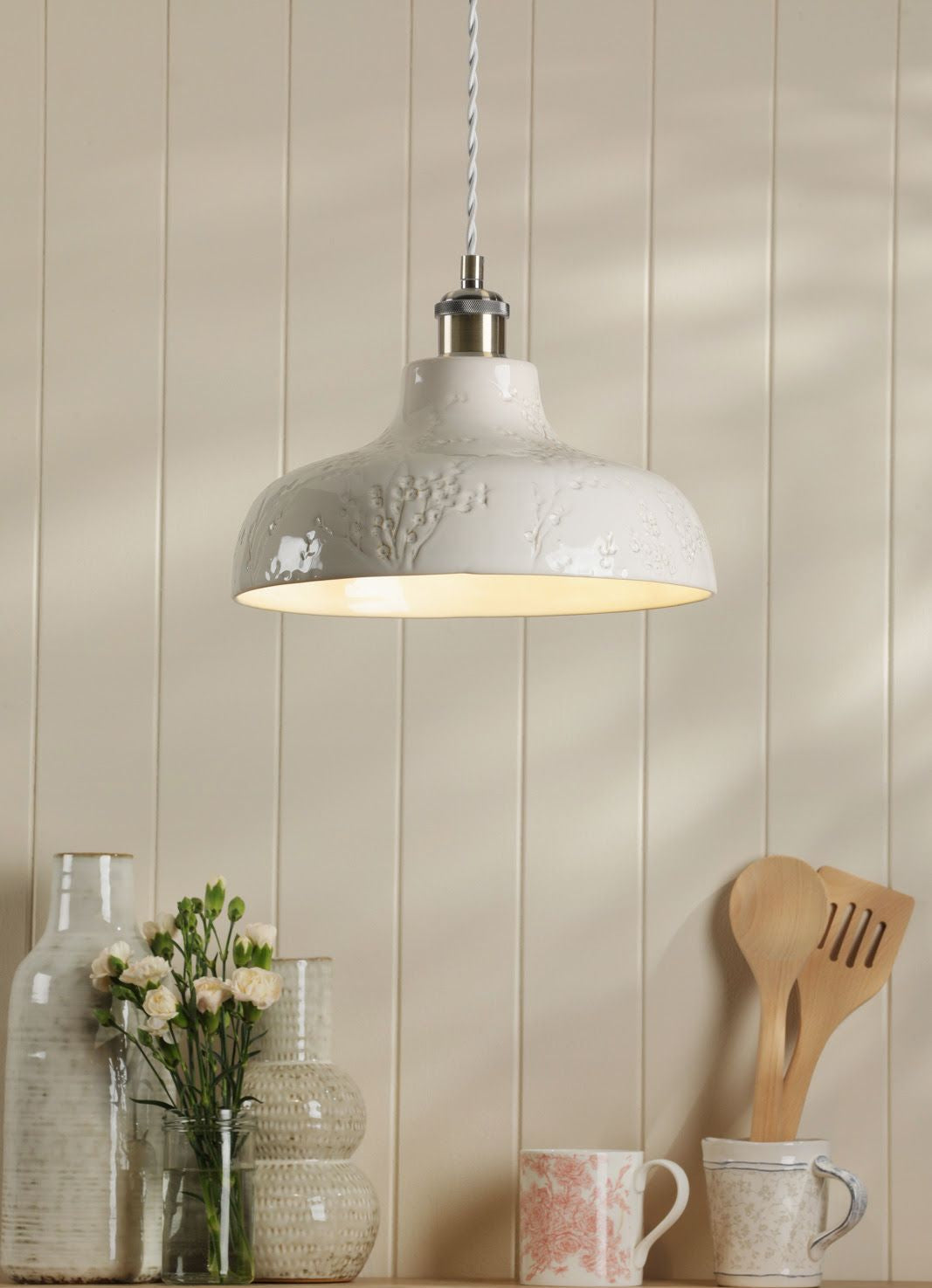 Elevate your décor with the gorgeous Pussywillow Ceramic Pendant. Its ceramic base is beautifully embossed with delicate Pussy Willow branches, making it a perfect choice for creating a warm and serene atmosphere. Hang this timeless pendant in the living room as a cosy focal point or in the kitchen to add effortless elegance to your space. For a cohesive, stylish look, pair it with other pieces from the Pussy Willow collection.