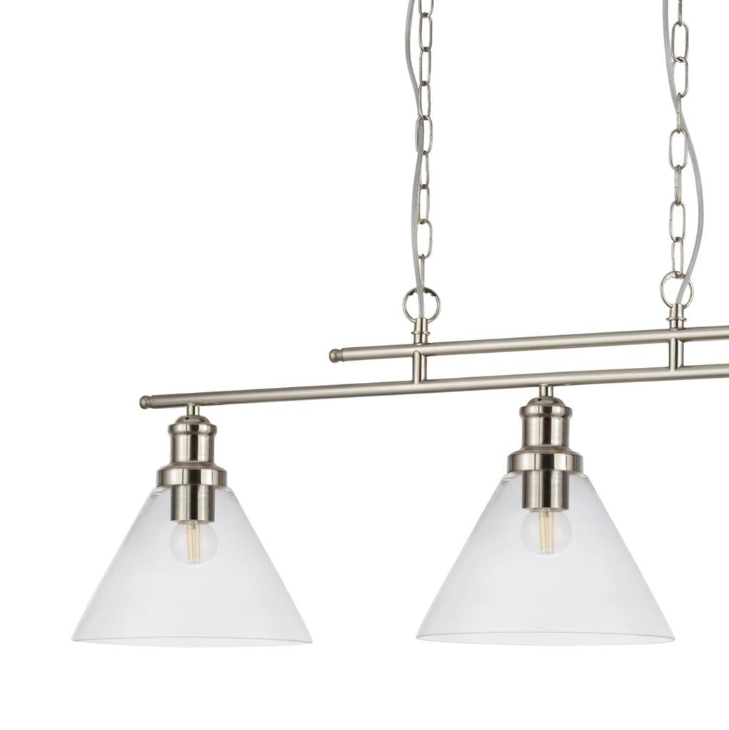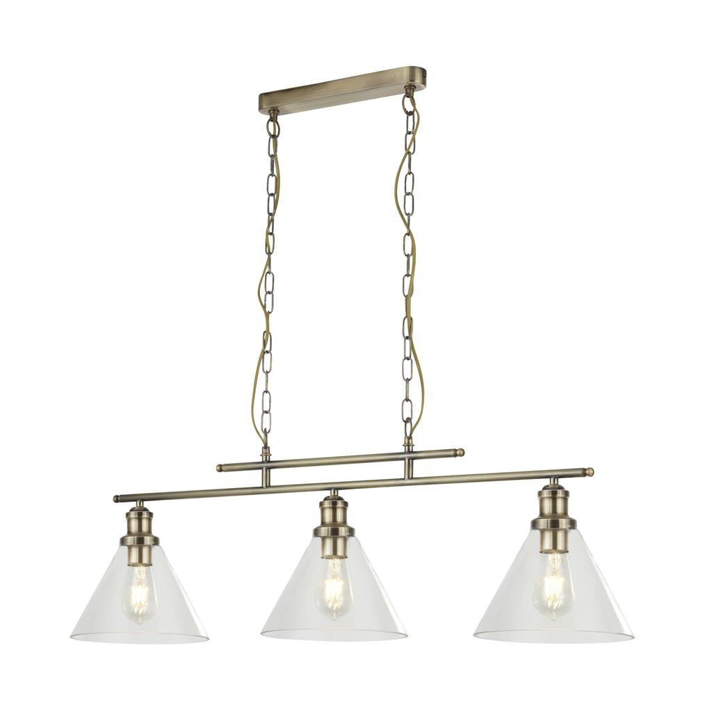 Perfectly suited to dining rooms or above kitchen islands, the Pyramid 3 light pendant is a classic design with a modern twist. Designed with clear glass shades and a simple antique brass finish chain. This product is a great choice for anyone wanting to update their interior.