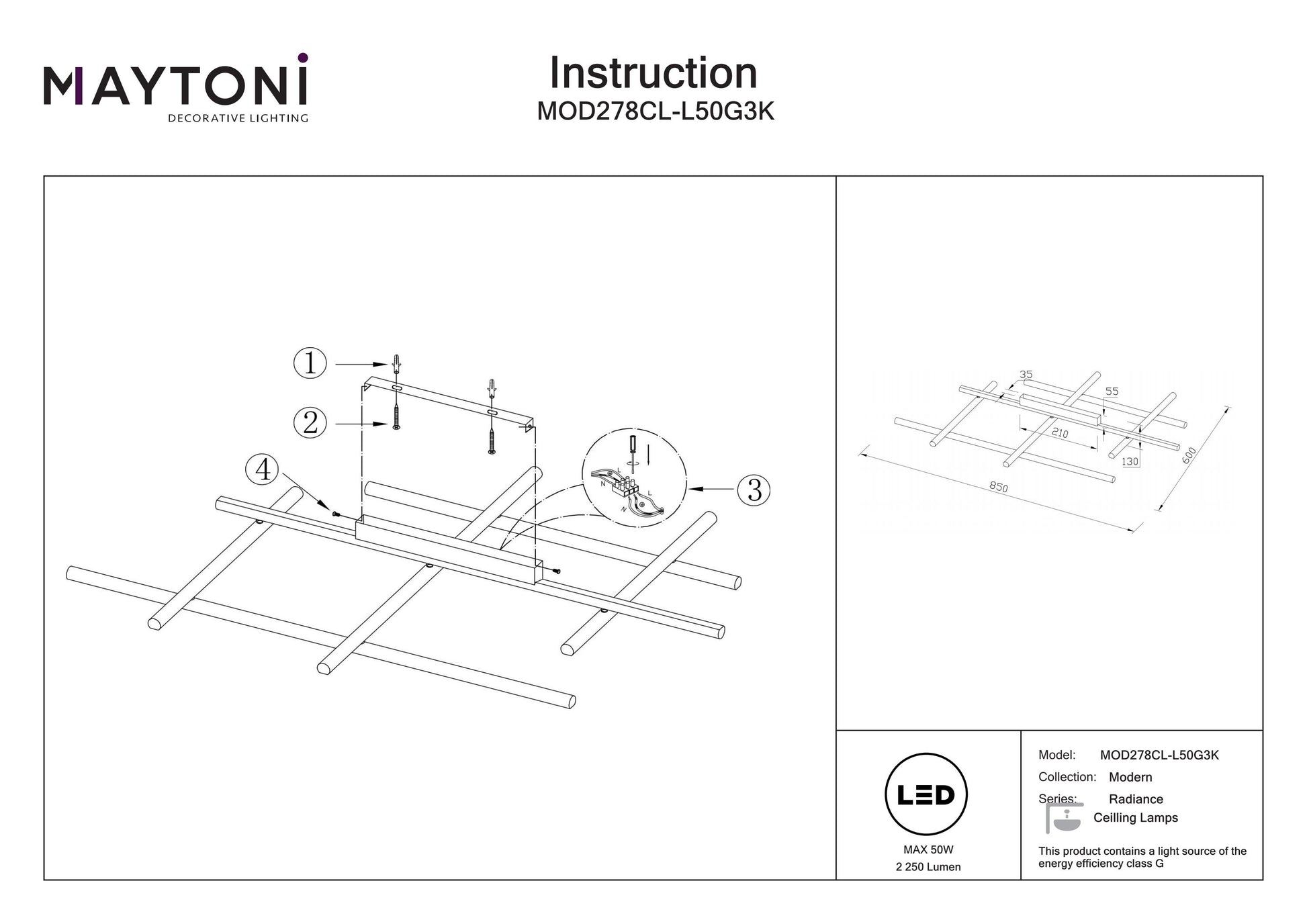 Metal fittings coated with a galvanic layer of satin brass. A built-in LED light source. Silicone diffuser. Color temperature: 3000K. Suspended luminaires are equipped with a 3-meter adjustable wire for rooms with high ceilings