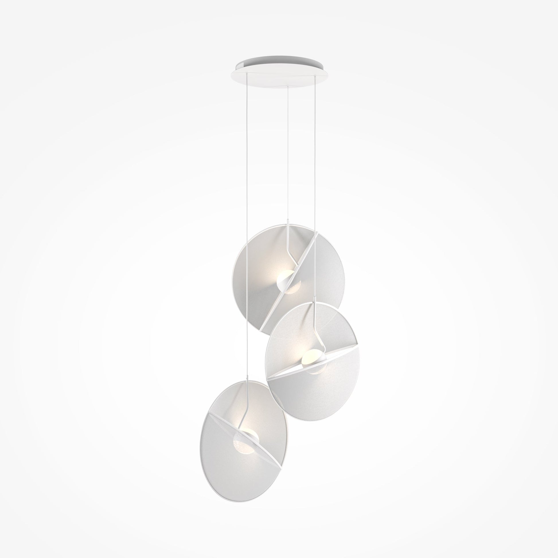 Fittings and dome lamp of metal and acrylic. Color — white. Decorative reflective element made of translucent textured fabric. Adjustable height. LED light sources with a color temperature of 3000K.