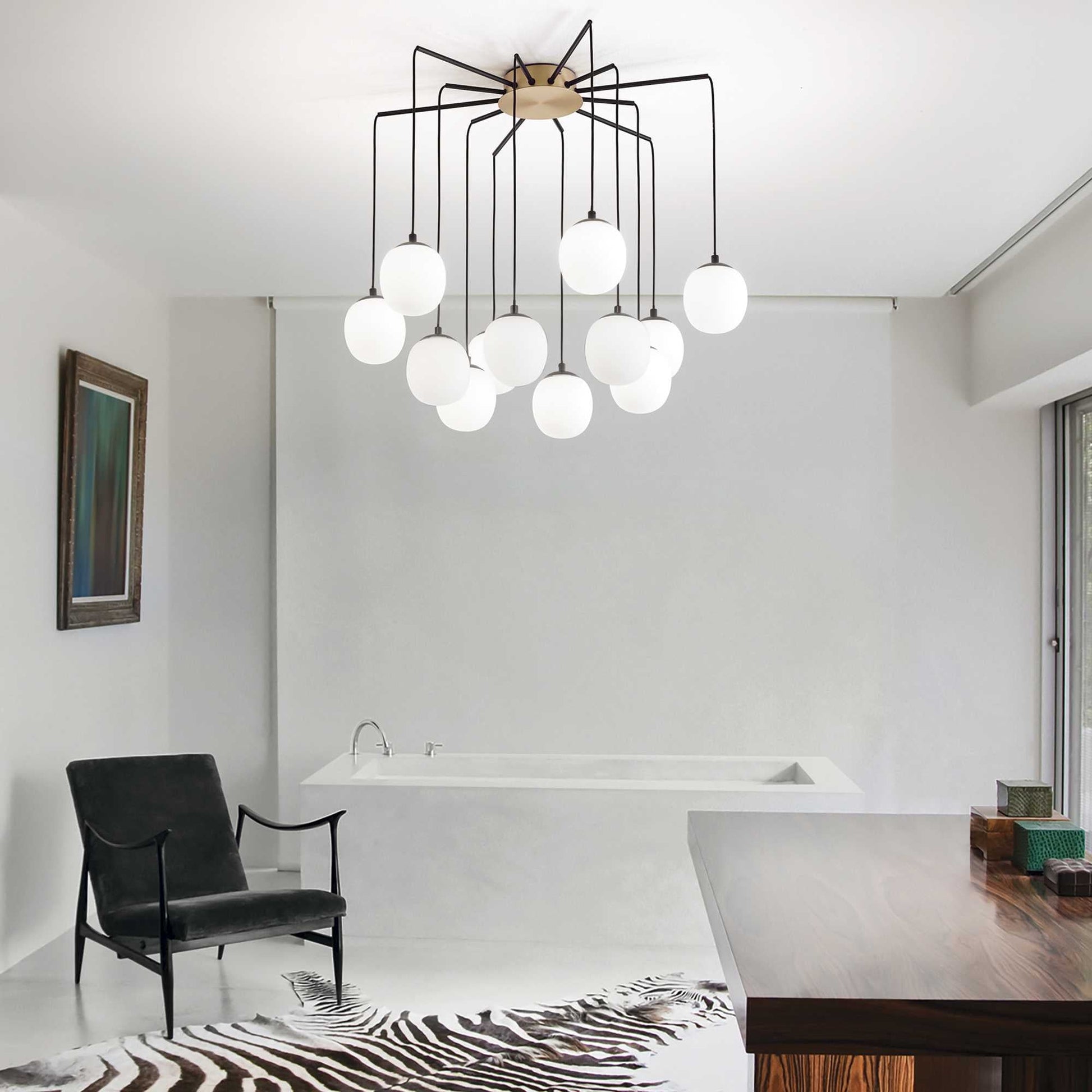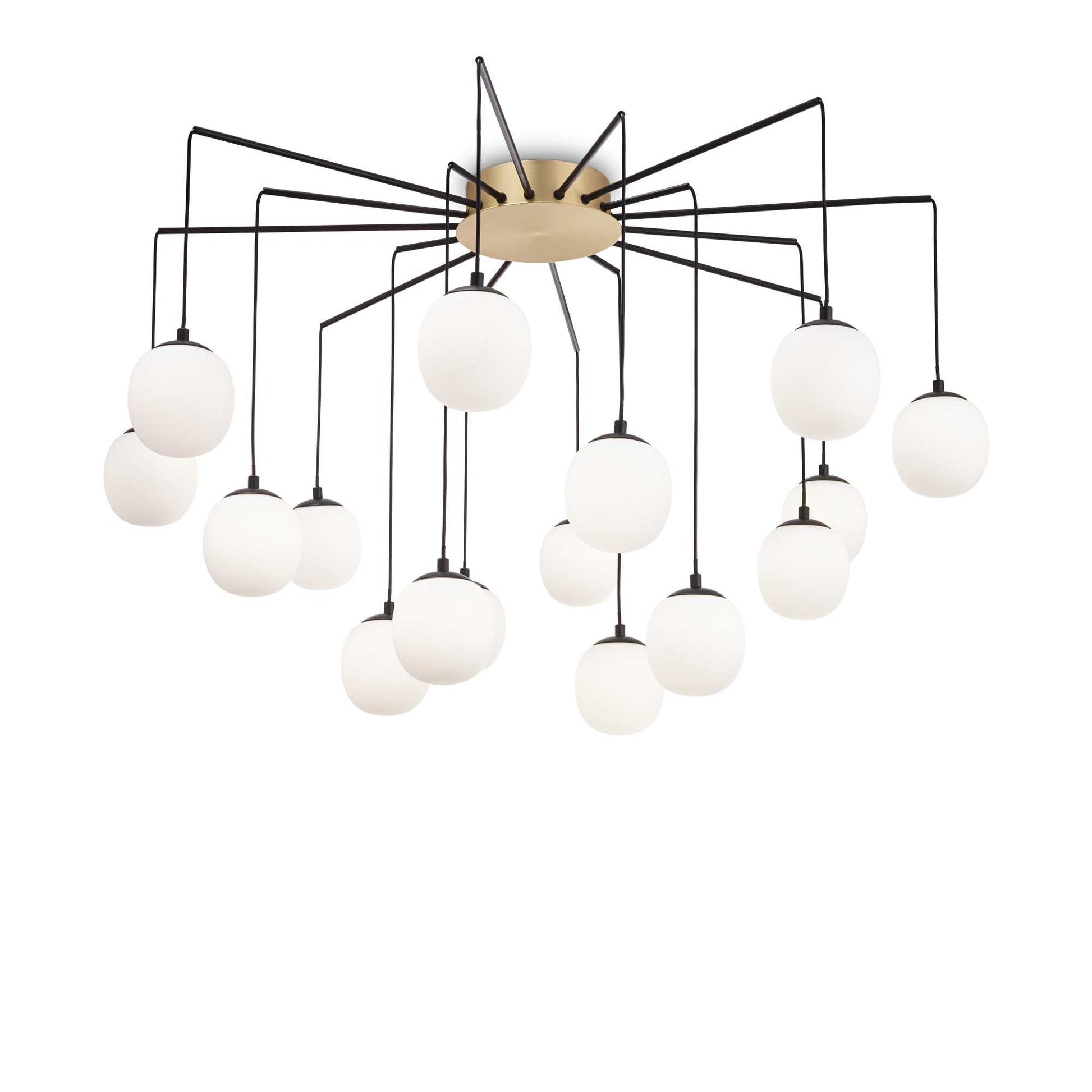 Metal frame with satin brass finished ceiling rose and matt black arms. PVC cables. White acid-etched blown glass diffusers.