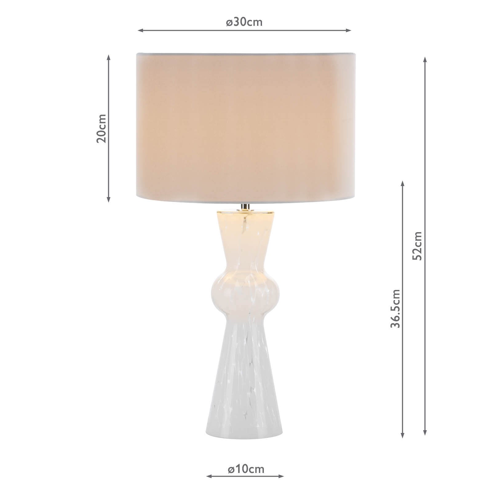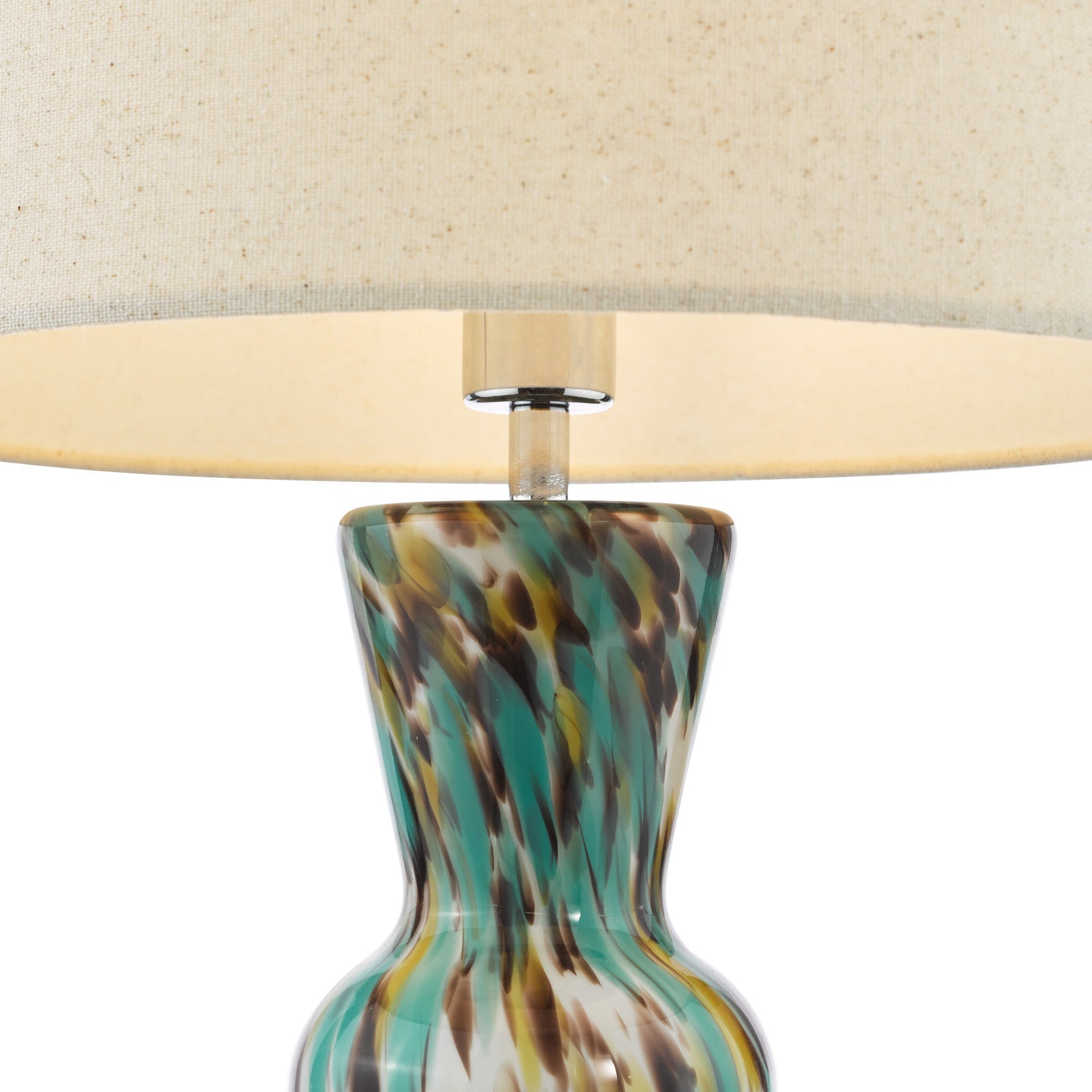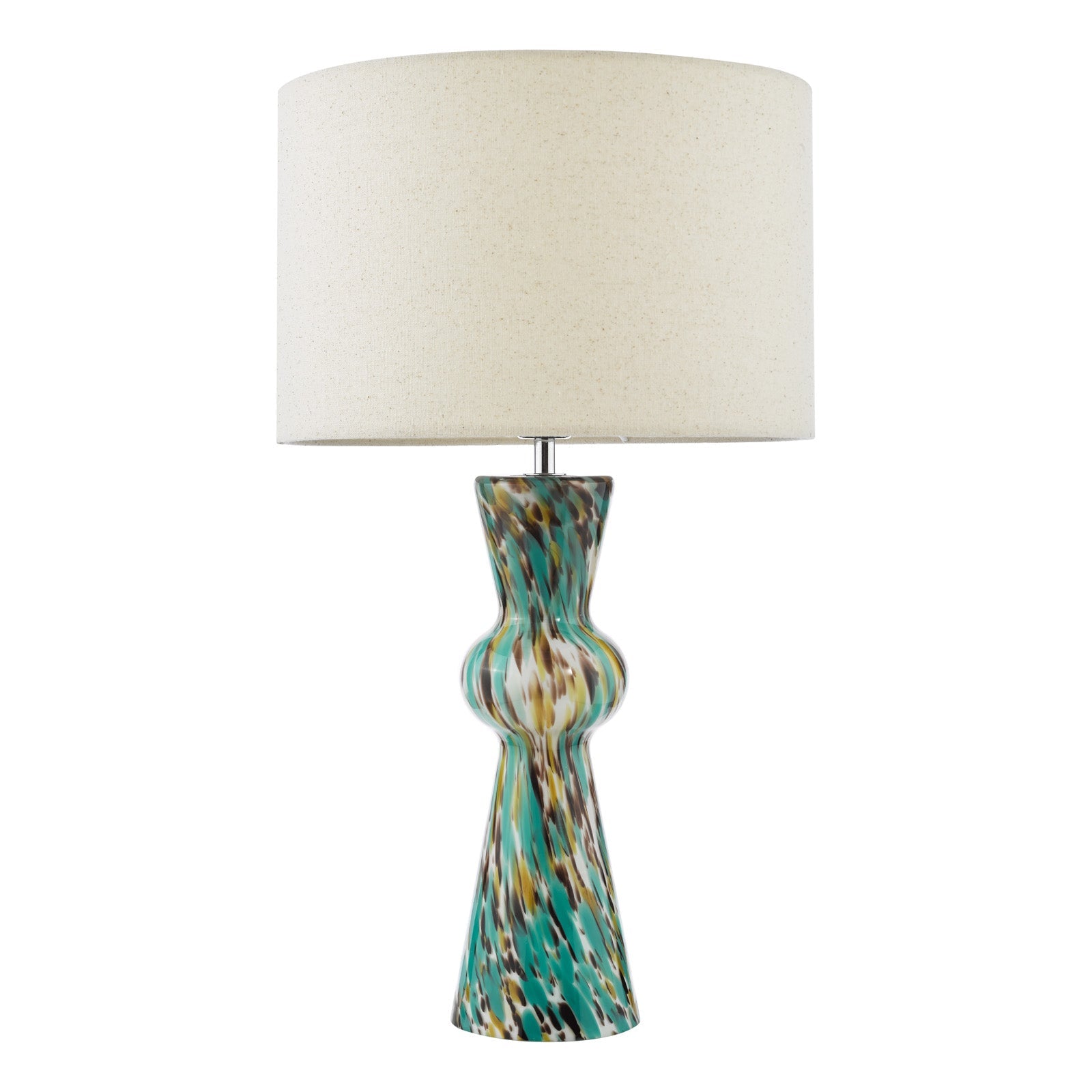 Illuminate your space with a touch of retro charm using the Rheneas Confetti Glass Table Lamp. This eye-catching piece features a stunning blue art glass base, adorned with a mesmerizing confetti pattern that makes each lamp a unique work of art—no two are exactly alike, as they are lovingly handcrafted. Topped with a natural linen shade, the lamp casts a warm, inviting glow, perfect for creating a cozy ambiance in any room. Whether placed on a side table, console, or bedside, the Rheneas Table Lamp effortlessly adds character and style to your decor.The Rheneas comes complete with a Natural Linen Drum shade.Bulb not included; takes 1 x 60W max SES CNDL. We recommend our BUL-E14-LED-17 bulb. Dimmable when paired with suitable bulbs.