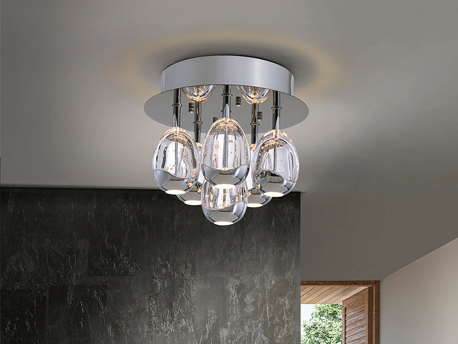 Ceiling lamp with 6 LED lights, made of metal. Drop-shaped solid glass shades in a champagne tonality with decorative bubbles inside. Equipped with 29W LED, delivering 2,800 lm at 3000K. DIMMABLE. Includes TRIAC driver and dimming set. This lamp is supplied with GRAVITY TOGGLES to improve ceiling fixing. It uses an LED driver with TRIAC and 0–10V dimming, includes a dimmer set with dimmer and radio frequency remote control, and can also be dimmed with a TRIAC or 0–10V wall dimmer. 110v version available.