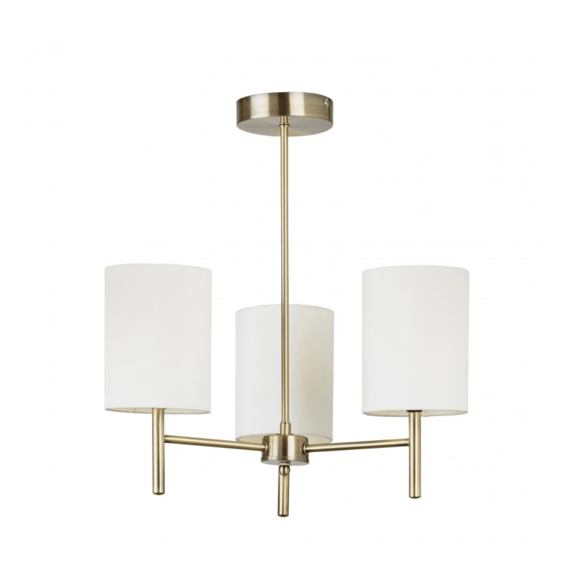 This 3 light ceiling light has a chrome/antique brass finish and is complemented with 3 off white faux silk shades. Suitable for use with LED lamps and dimmable.