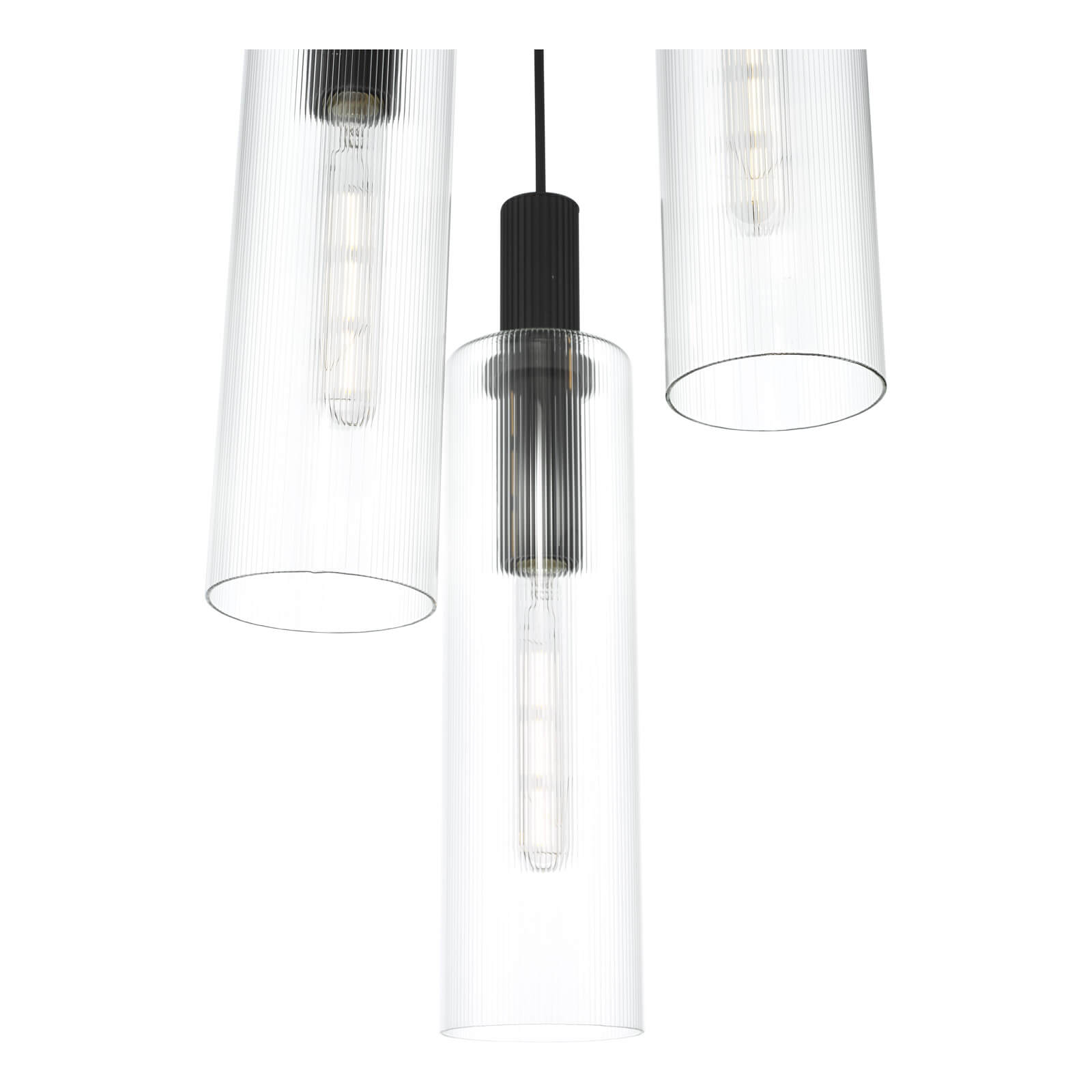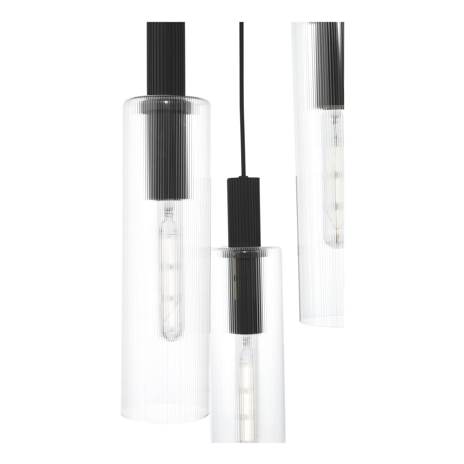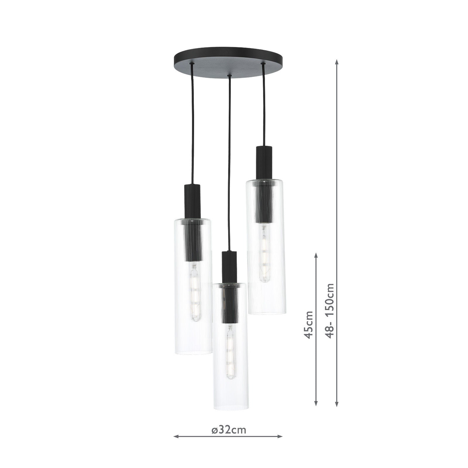 Elevate your space with the Ruben 3 Light Cluster Pendant, a sleek and stylish lighting fixture designed to make a bold statement. Finished in satin black, this pendant showcases elegant ribbed glass shades that can be easily adjusted to any height along the frame, introducing a modern touch to your decor. Perfectly suited for illuminating larger areas, such as stairwells, dining rooms, or kitchen islands, the Ruben 3 Light Cluster Pendant not only provides ample lighting but also adds a sophisticated flair to your home.Height is adjustable at the point of installation (48-150cm).Bulb not included; takes 3 x 40W max ES Tube. We recommend our BUL-E27-LED-25 bulb. Click here to shop.Dimmable when paired with suitable bulbs.