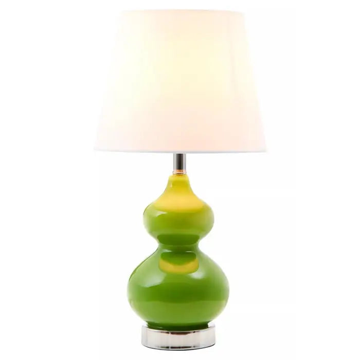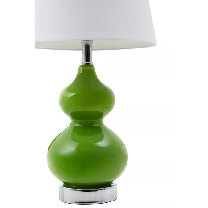 The lamp has a curved glass frame in an uplifting light green hue and a chrome base for support. The round white shade adds to the modern aesthetic of the lamp. This lamp is a great option to bring some fun colour to a room.