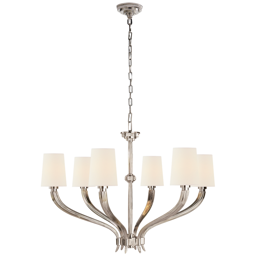 The elegant Ruhlmann series by Chapman & Myers presents a variety of lighting options for virtually any space in the home. Pendants, chandeliers, sconces and even a ceiling fan come in a variety of sleek finishes with ribbed detailing and elegant paper or glass shades for sophisticated illumination.