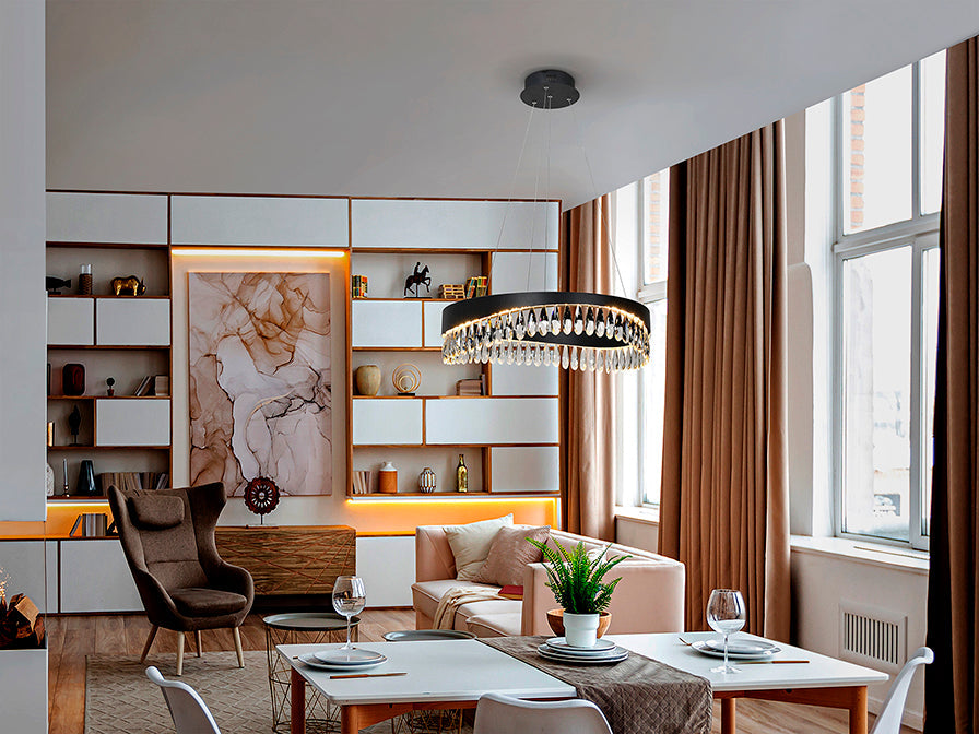 Lamp made of metal and aluminium, matt black finish. Diffuser of faceted crystal drops. Adjustable in height. LED lighting 30W, 1300Lm, 3000K.