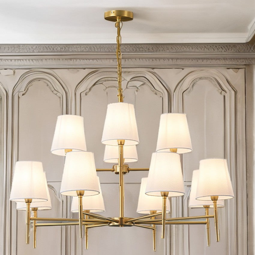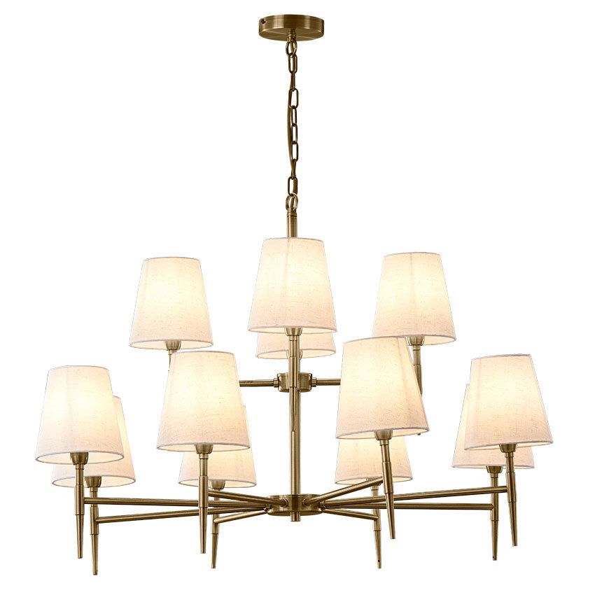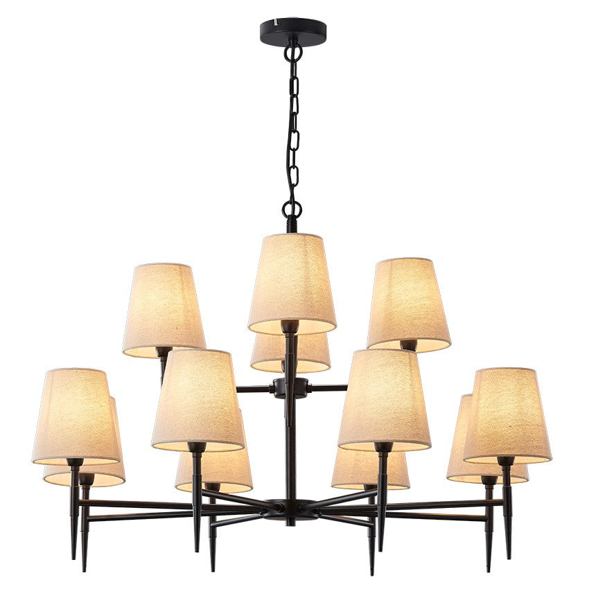 This sophisticated 12-light chandelier features a timeless two-tier design, finished in elegant black. Its warm metallic tone pairs beautifully with the soft beige fabric shades, which gently diffuse light to create a welcoming, ambient glow. Suspended from a matching chain, this chandelier is ideal for dining rooms, grand foyers, or living areas, where it serves as a stunning focal point. Blending traditional charm with modern elegance, it brings a sense of luxury and warmth to any space.