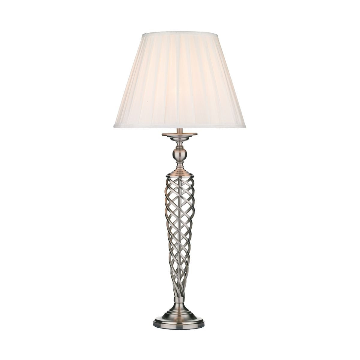 The SIA Table Lamp has an antique base with open metal work decoration and white pleated shade.
