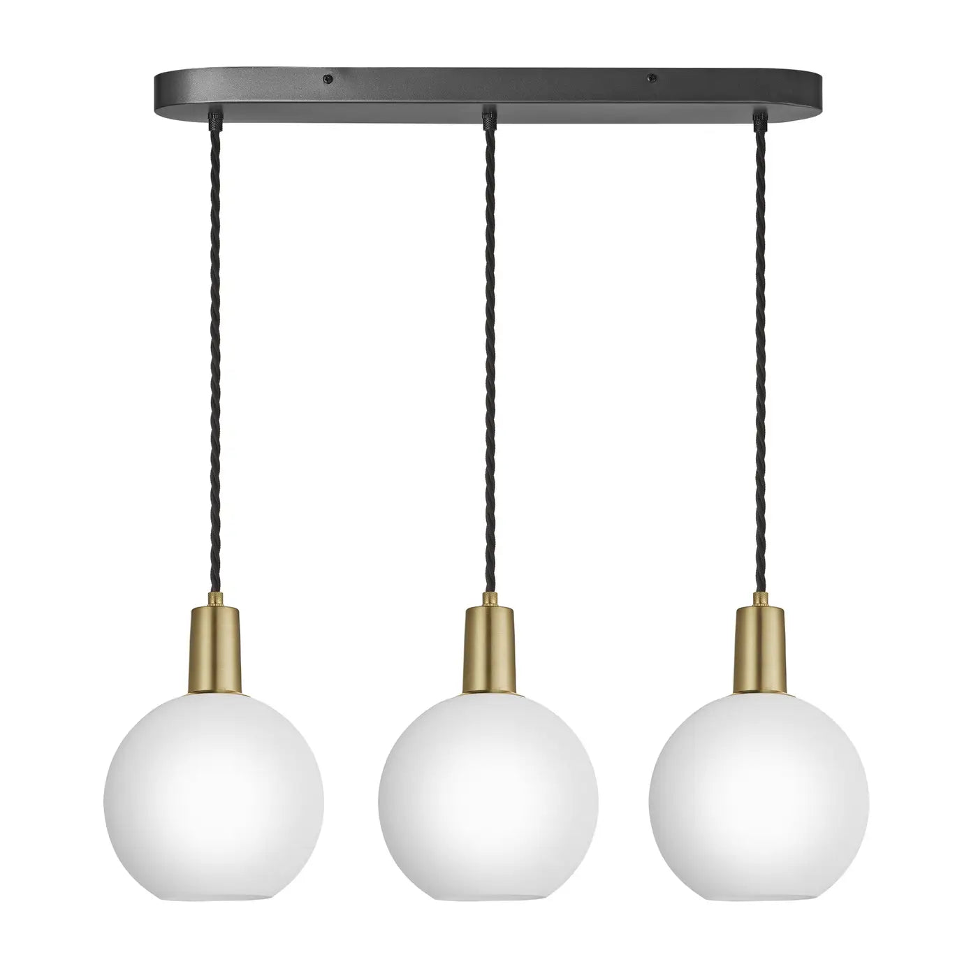 Includes1 x 3-input ceiling rose3 x single pewter bulb holders (Each with 2 m /79" of black twisted fabric flex connected to the holder only, enabling height to be adjusted - electrician required) 3 x opal glass white globe shades |
