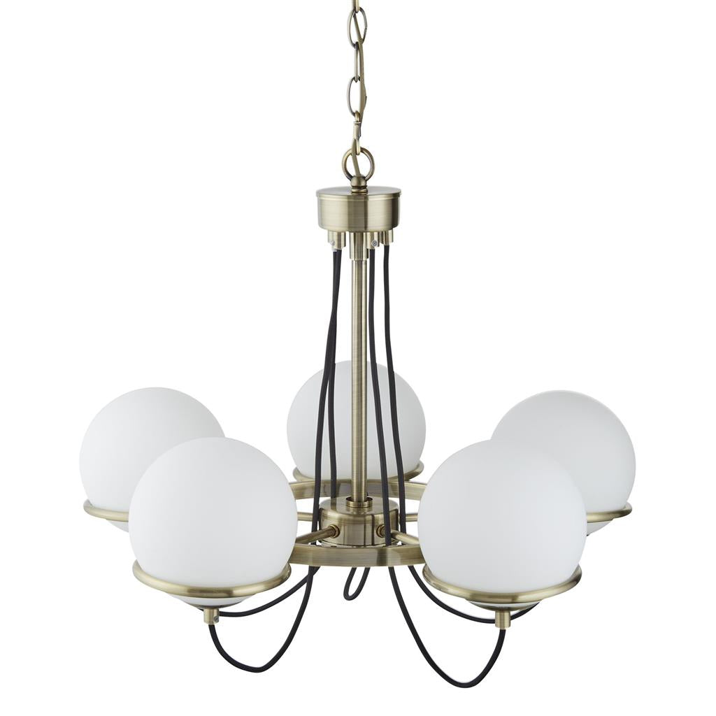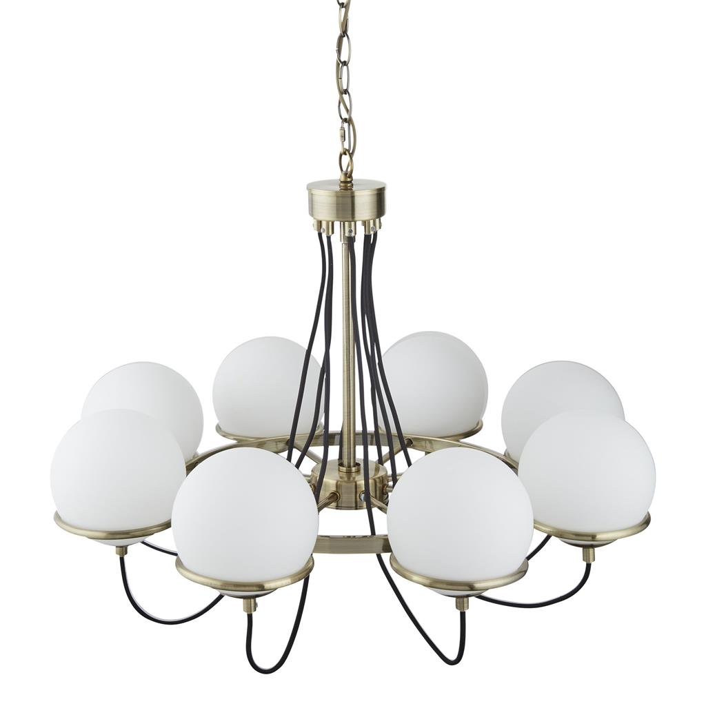 Make a statement in your living room using this distinctive 8 light Sphere ceiling fitting. Complete with opal white glass and antique brass, the item has a nostalgic and vintage feel to it. The ceiling light is given a modern update as the black braided cable detail covers the body and suspends beneath the lights.