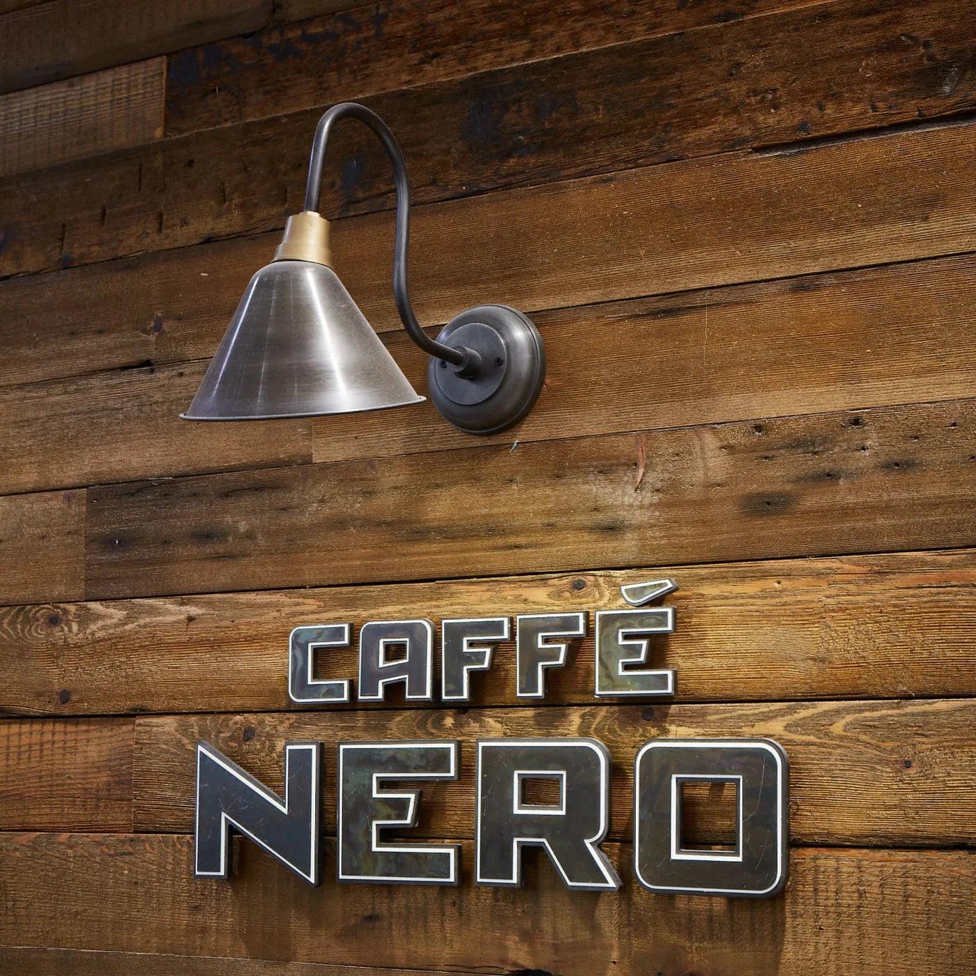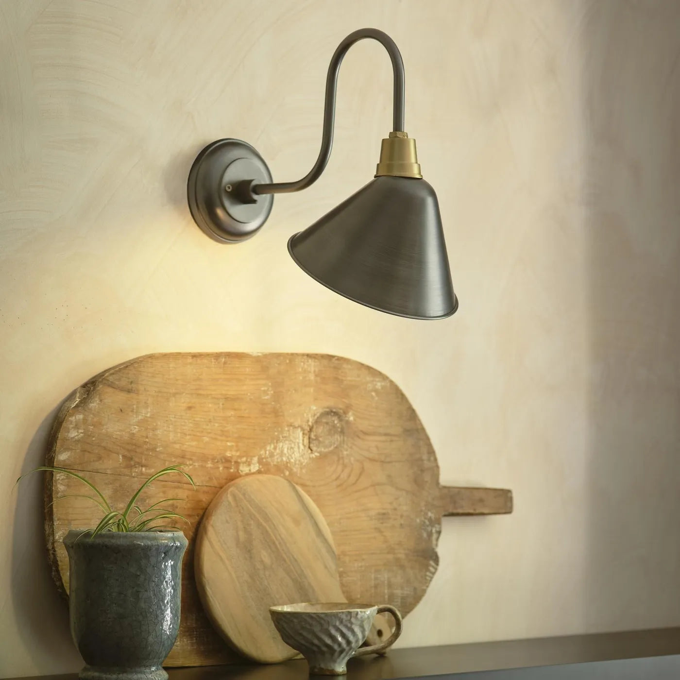 A classic Swan Neck wall light featuring a fixed cone shade, a curved metal holder, and a matching wall plate. Available in Brass and Pewter finishes.