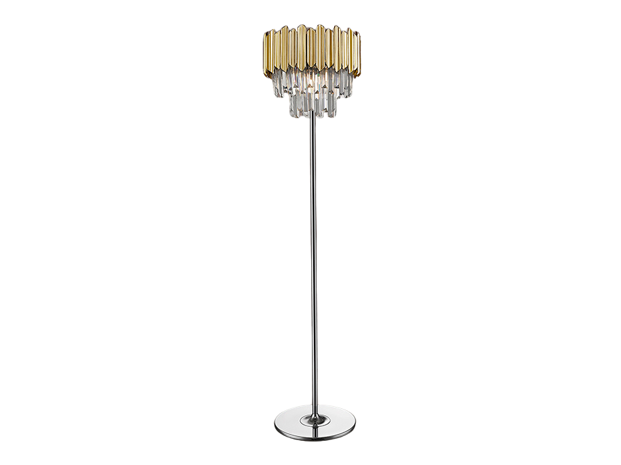 Floor lamp made of metal, chrome finish. Shade of faceted glass prisms with abs pieces finished in golden plating