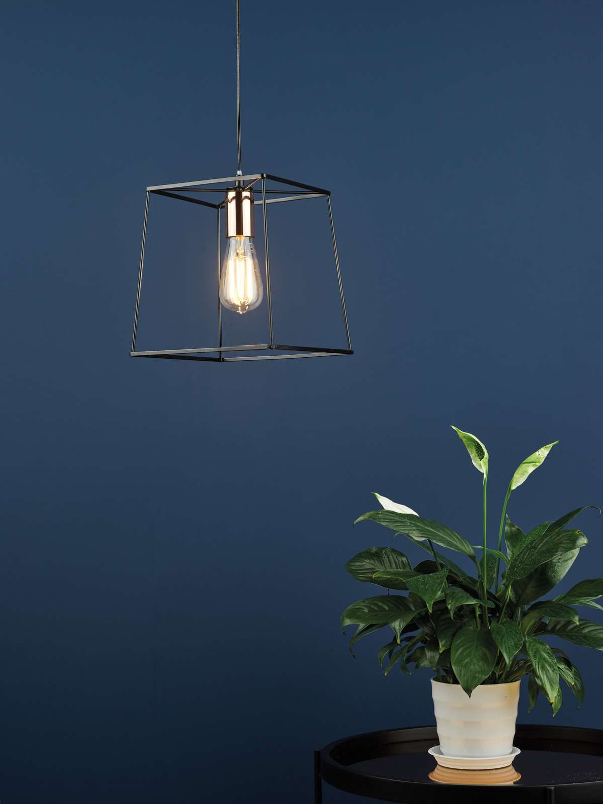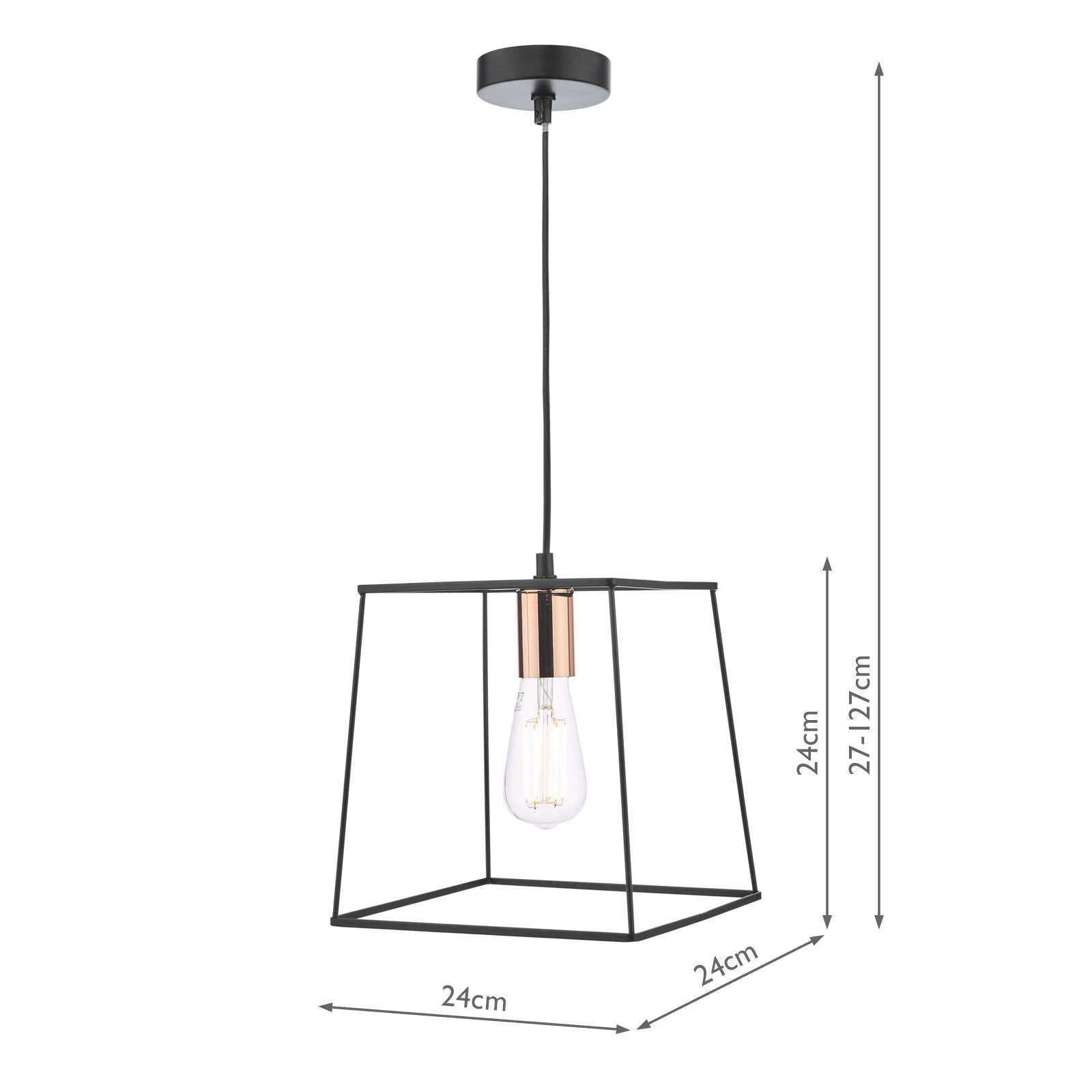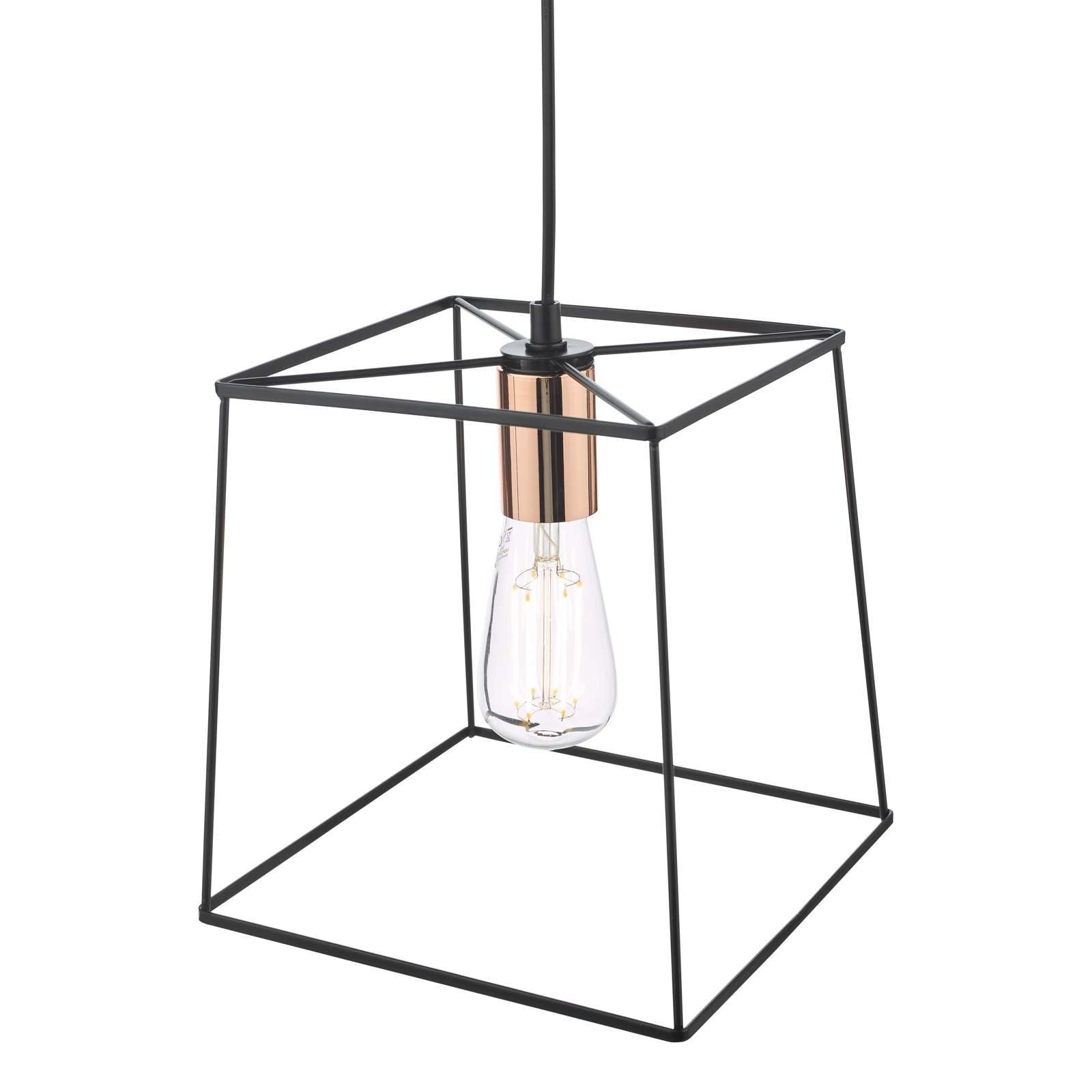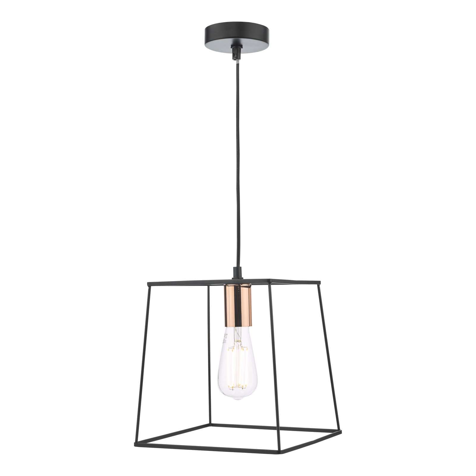 Create a sense of drama with the Tower pendant from dar Lighting, which features a wire frame box in matt black and polished copper. A matching 6 light cluster pendant is also available.