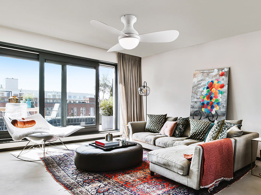 Ceiling fan with CCT LED light, made of metal with matt white finish and blades of glossy white acrylic. Opal acrylic diffuser. DC motor of 6-speed and reverse, 3 color temperatures. Timer. C Remote control included. 24W LED, 1920 lm, 3000-4500-6000 K. Fan: 3-blade propeller, Extended Ø117 cm. Radius of action: Ø180 cm (measured 140 cm below the fan). 35W DC motor. 6 Speeds. Reverse movement. Rumor: 37/49Db..110v version available.