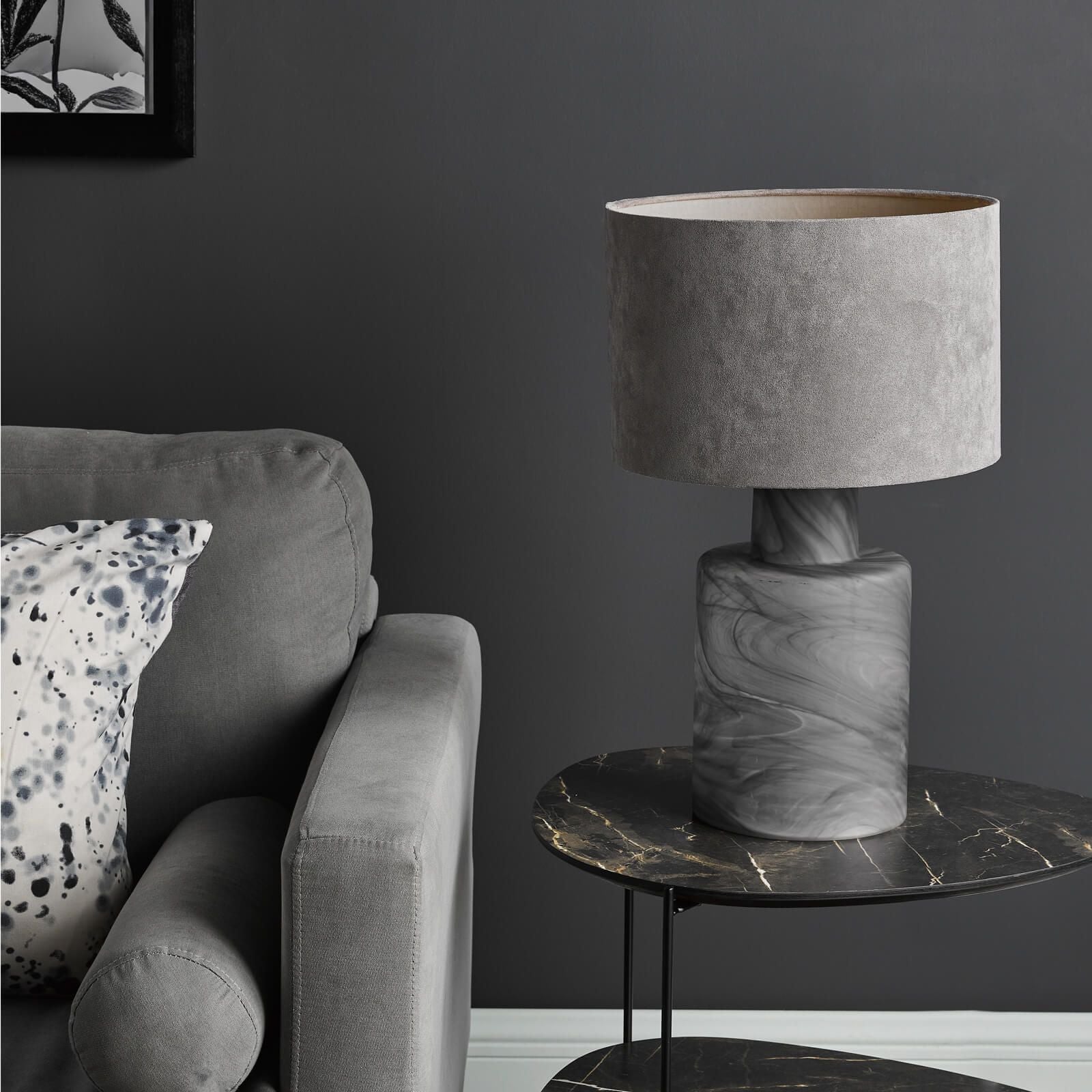 Enhancing its visual allure, the lamp boasts a frosted marbled glass base and a grey textile cable, both contributing to its overall elegance. The convenience of an inline rocker switch, mounted on the grey braided cable, ensures effortless operation. Whether you're engrossed in a book or unwinding after a long day, the Wanda Table Lamp casts a captivating ambient light that transforms your space.