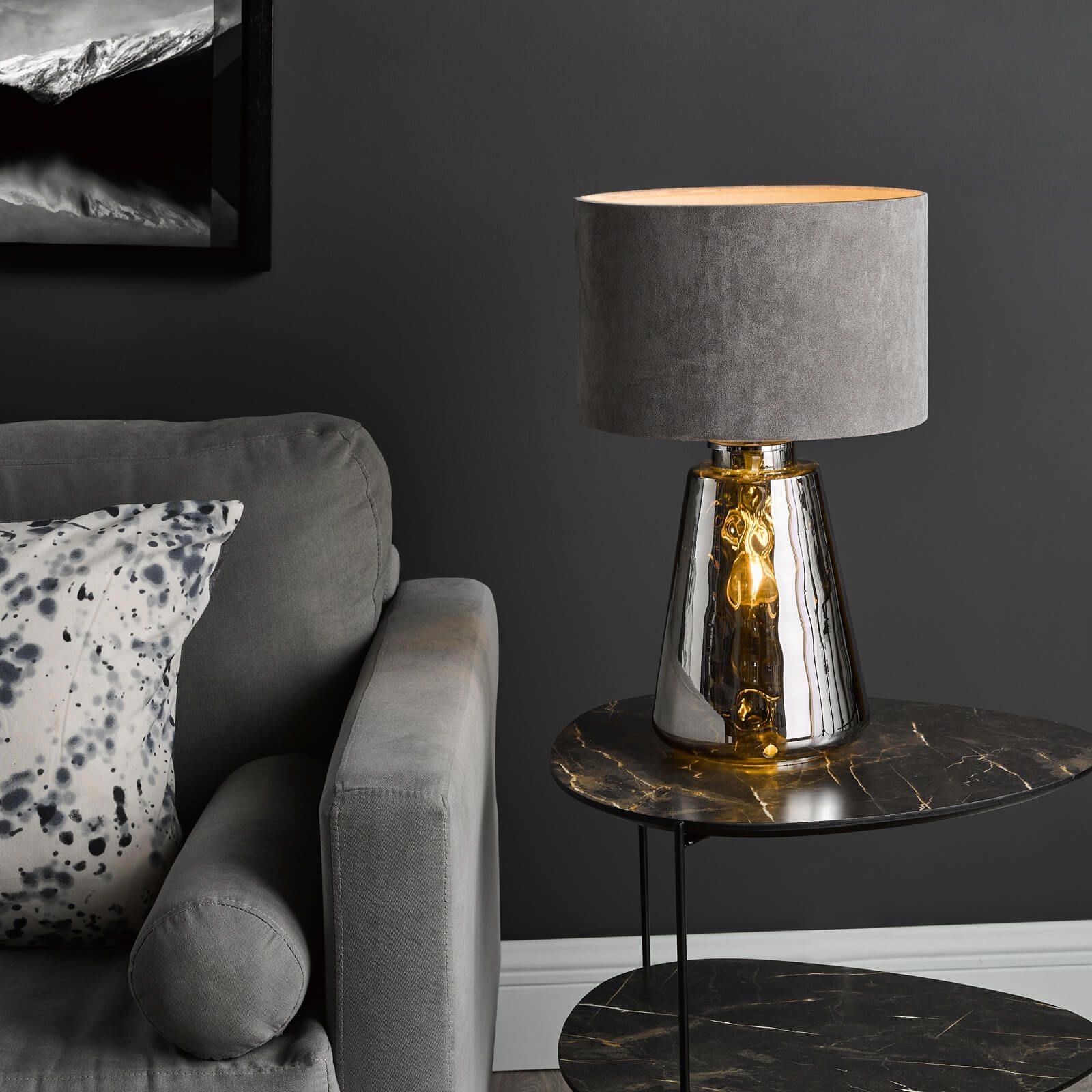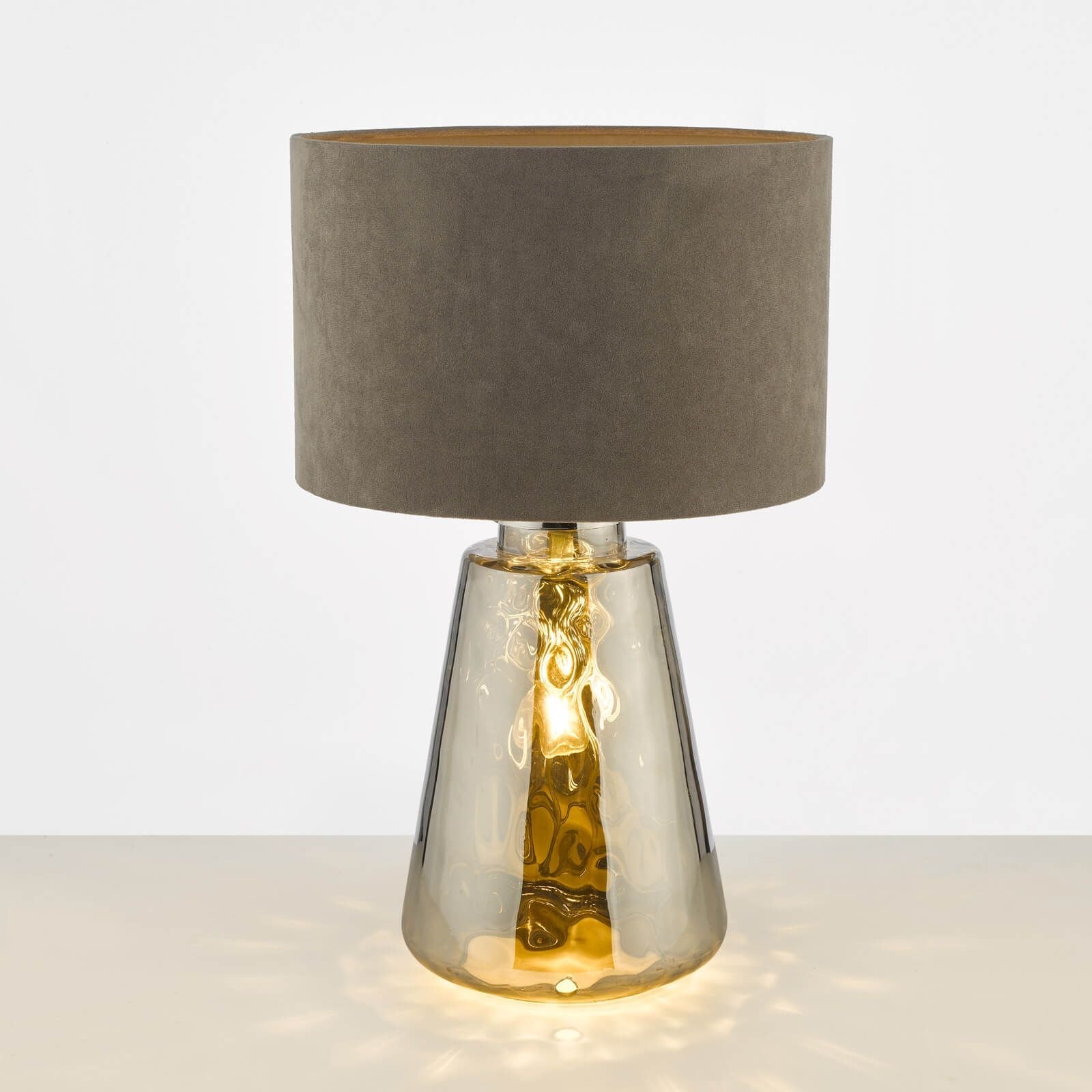 Introducing the Wycliffe Table Lamp – a versatile embodiment of elegance that seamlessly enhances your home's ambiance. The lamp's standout feature is its base, crafted from smoked dimple glass, while the shade exudes sophistication in grey velvet. The Wycliffe table lamp offers a dual lit lighting arrangement, providing you with the flexibility to create a warm ambient glow or a more subtle lower light, perfect for achieving an atmospheric effect. The clear cable comes with an inline rocker switch, ensuring effortless control and convenience.