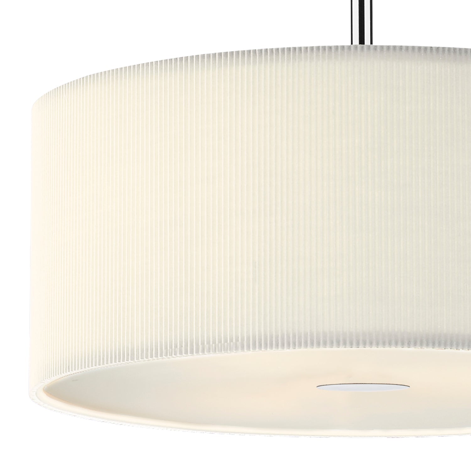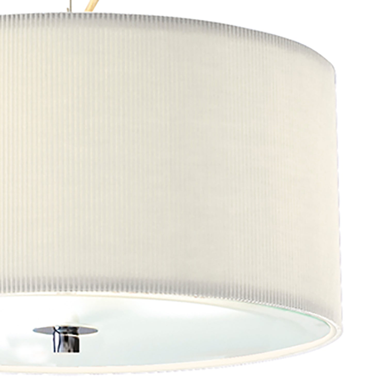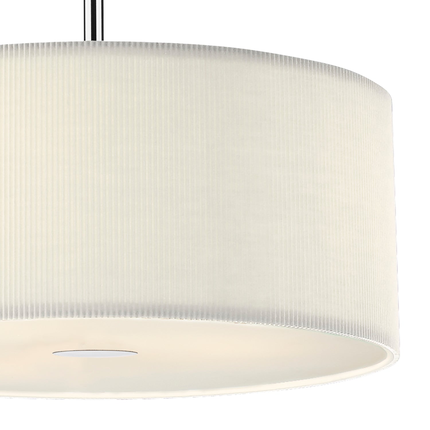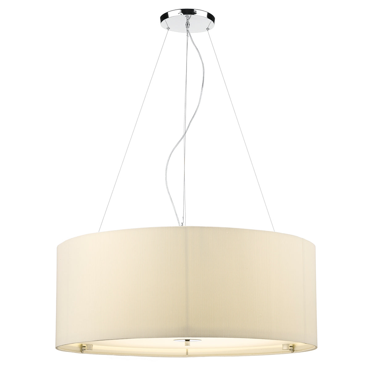 The 90cm Zaragoza 6 Light Pendant features a sleek polished chrome stem and ceiling rose, paired with a micro-pleated cream cotton drum shade. The shallow fabric shade’s subtle ribbed texture adds modern interest, while a frosted acrylic diffuser softens the light for a warm, inviting glow. Height is adjustable at the point of installation (50-300cm). Dimmable when paired with suitable bulbs.